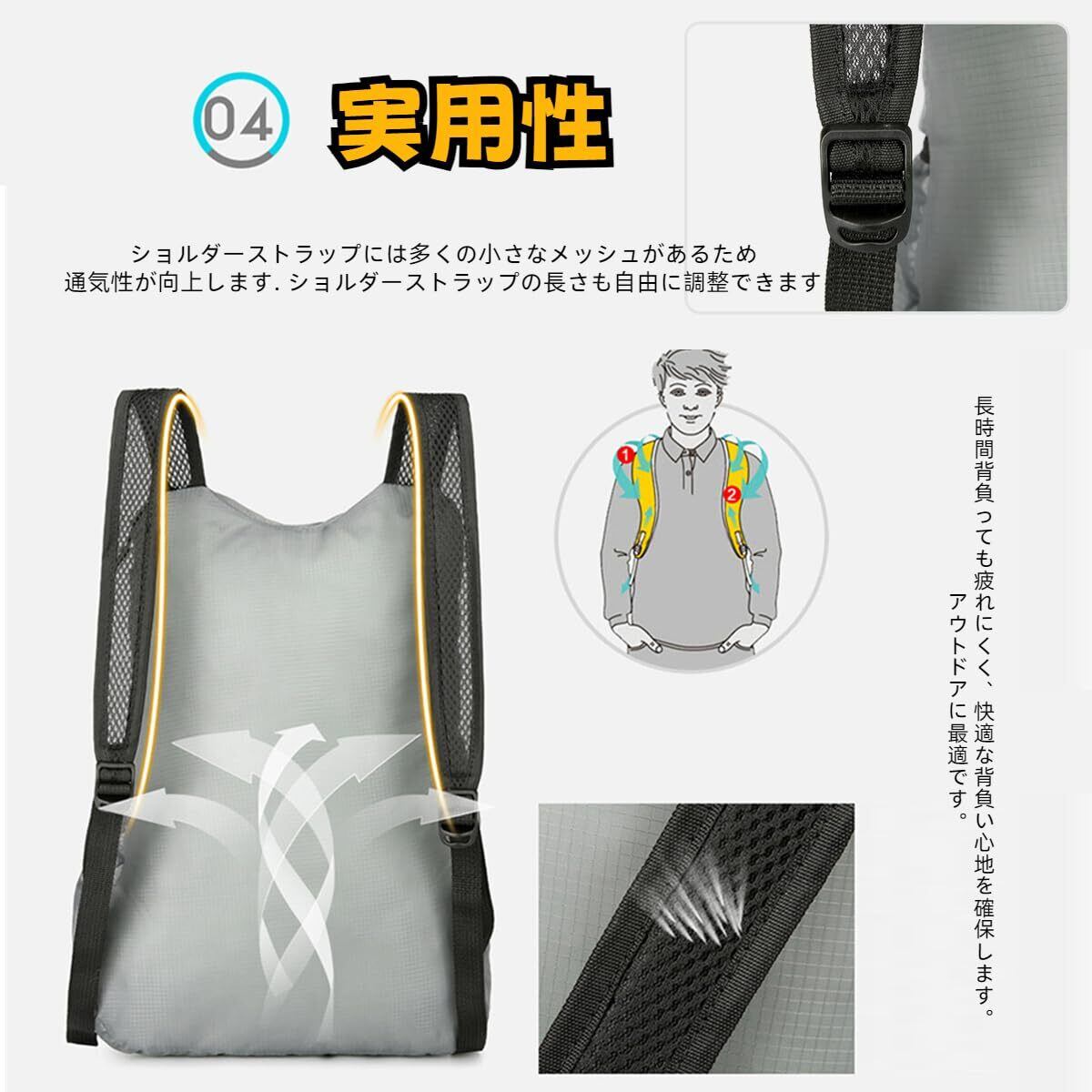通気性:ショルダー部分通気性の高いメッシュを使用した、快適な使用感を実現。長時間背負っても疲れにくく、快適な背負い心地を確保します。アウトドアに最適です。