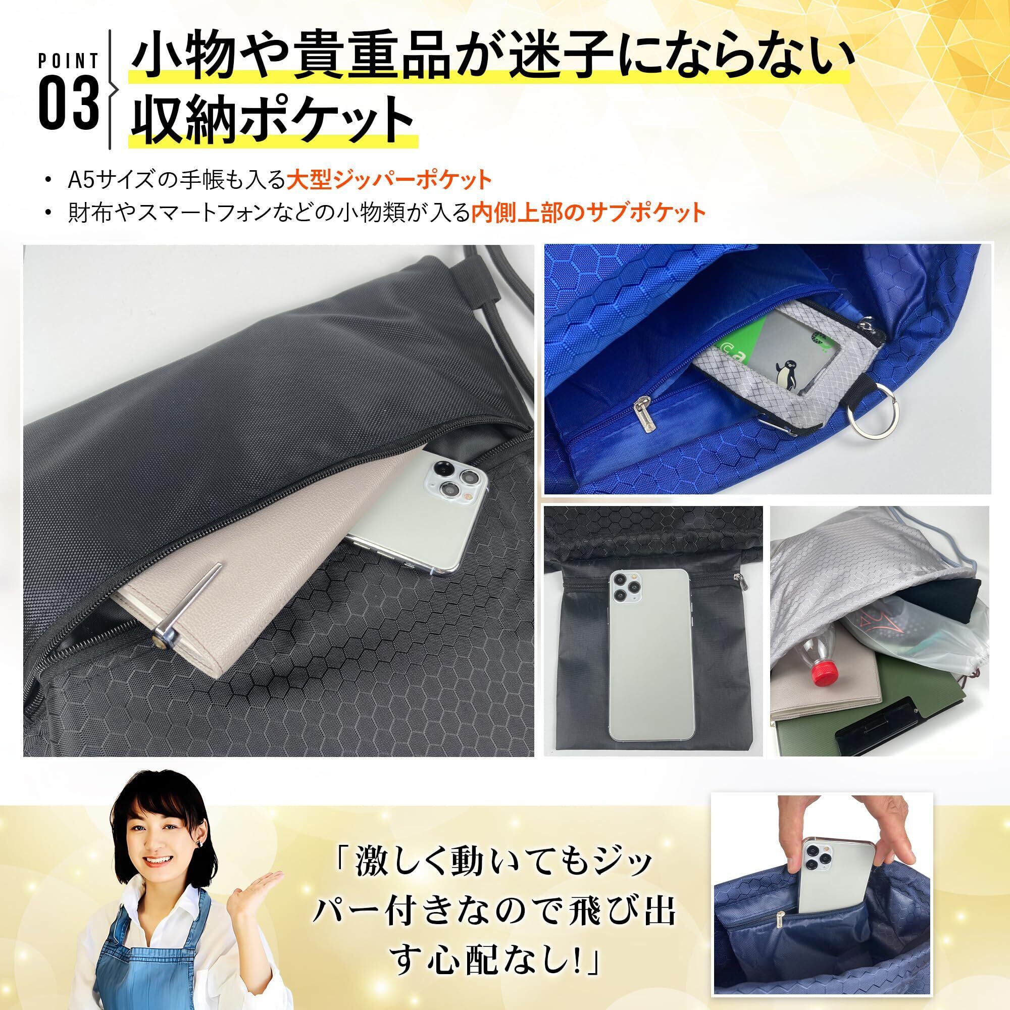 【便利な防水袋付き】濡れたタオルやシューズを分けて収納できる防水袋(40×30cm・マチ付き)を付属。ジムやサウナ、プールでも大活躍。半透明だから中身が見えて出し忘れも防げ、バッグ内を清潔に保てます。
