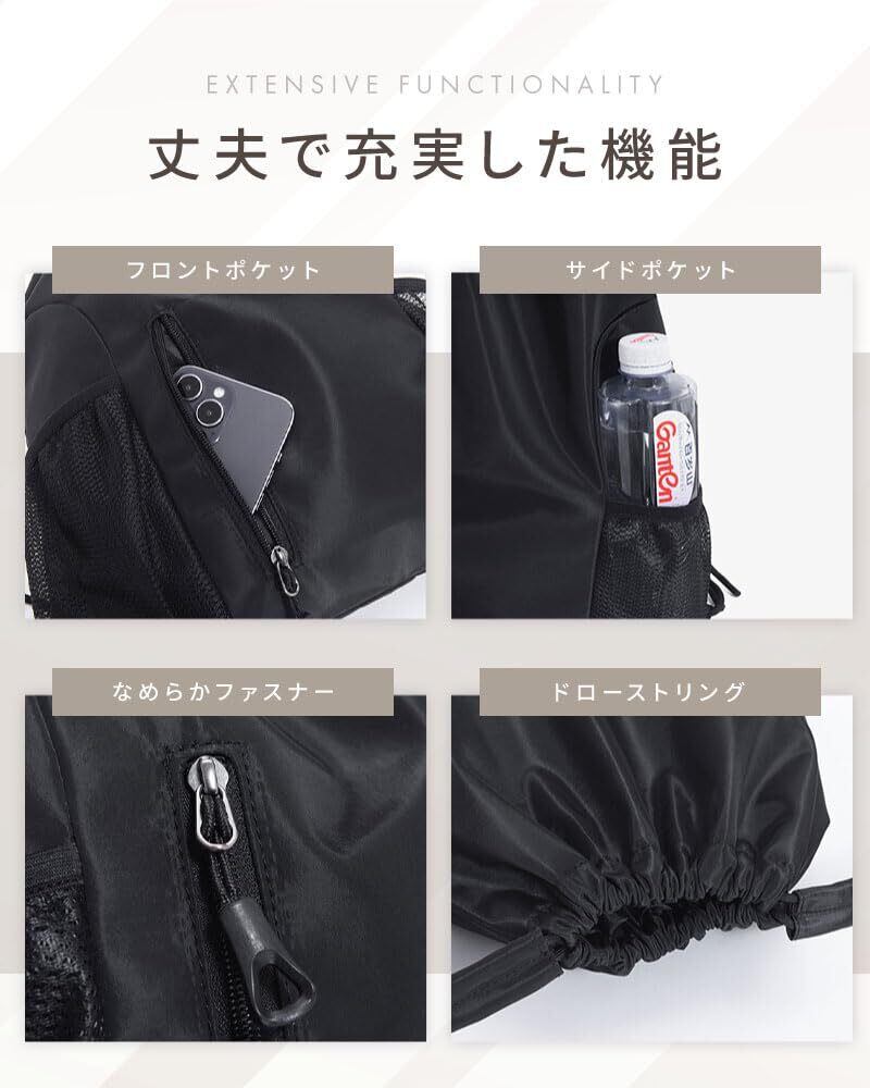丈夫で機能も充実しており、フロントポケットやサイドポケット、なめらかなファスナー、ドローストリングなど使いやすさにこだわった仕様です。