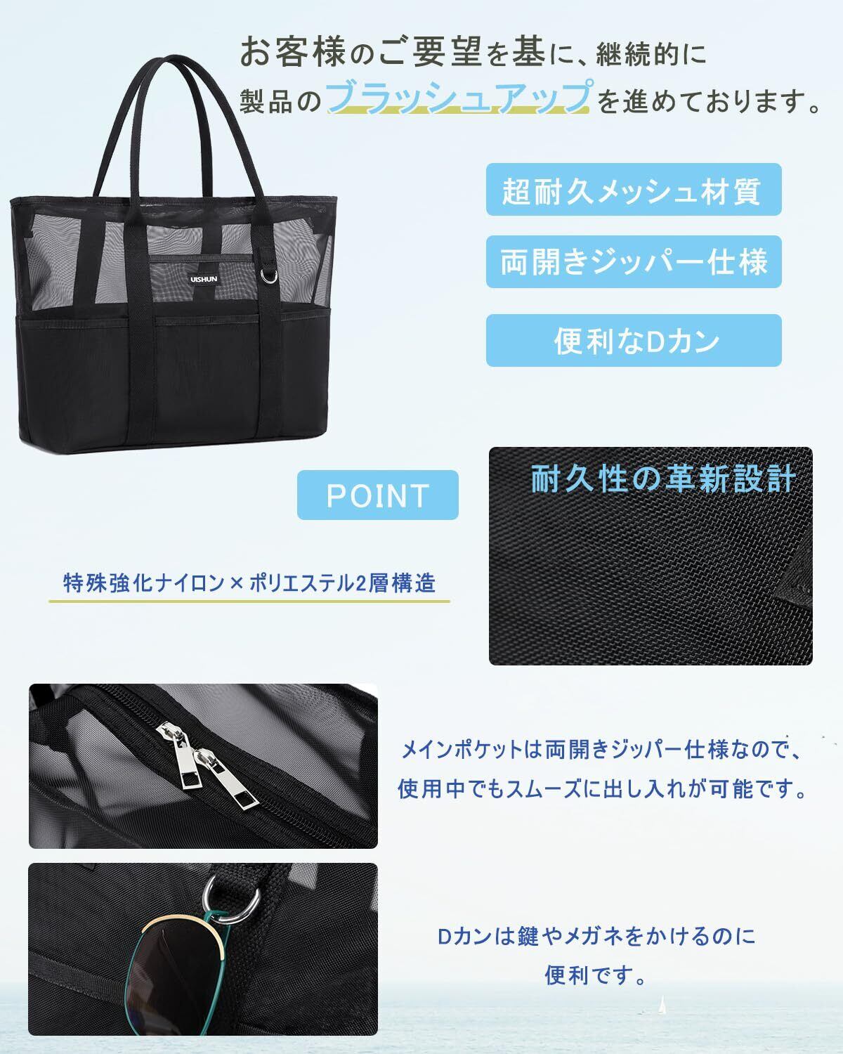 [uishun] ビーチバッグ プールバッグ 【自立式×耐久性×軽量型】【従来品より30%高密度】メッシュバッグ 大容量 温泉 大人 beach bag ジム 銭湯 水泳用
