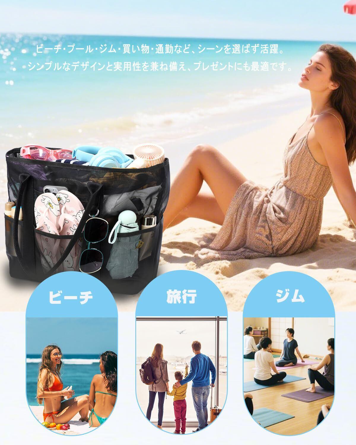 【365日使える多機能メッシュバッグ】夏だけでなく、一年中使用可能。ビーチ/プールはもちろん、ジムの汗濡れ用品・温泉の着替え・旅行バッグ・買い物のエコバッグとして年間を通して活躍、機能的なビーチバッグです。
