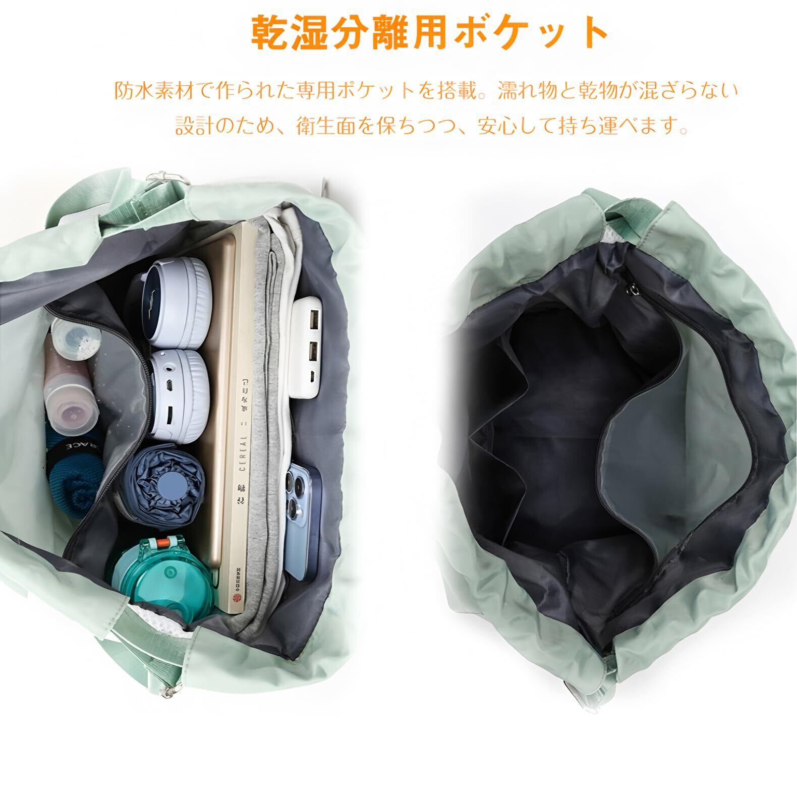 【上下層乾湿分離】巾着開閉で中身の出し入れがしやすい巾着袋です。正面にはジッパータイプのポケットが各1個あります。内部には乾湿分離ポケットが1個、小物ポケットが2個あります。底部にはシューズ収納ポケットが1個あり、靴の持ち運びに非常に便利です。