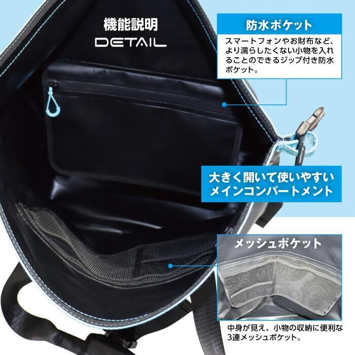容量20リットルの頼れる!防水トートバッグ。 防水素材を高周波で溶接し、 水が入る余地をなくすことで完全防水を実現。 外側正面にウェビングテープとDリングを配置し 手持ちのポーチなどをつけることが可能。 リフレクターテープで暗所での視認性を確保。 内側メインコンパートメントには、 小物の収納に便利な3連メッシュポケットと ジップ付き防水ポケットの2つを装備。 女性でも持ちやすいサイズ感で日常使いからアウトドア、 非常時の持ち出しバッグなどに使用いただけます。