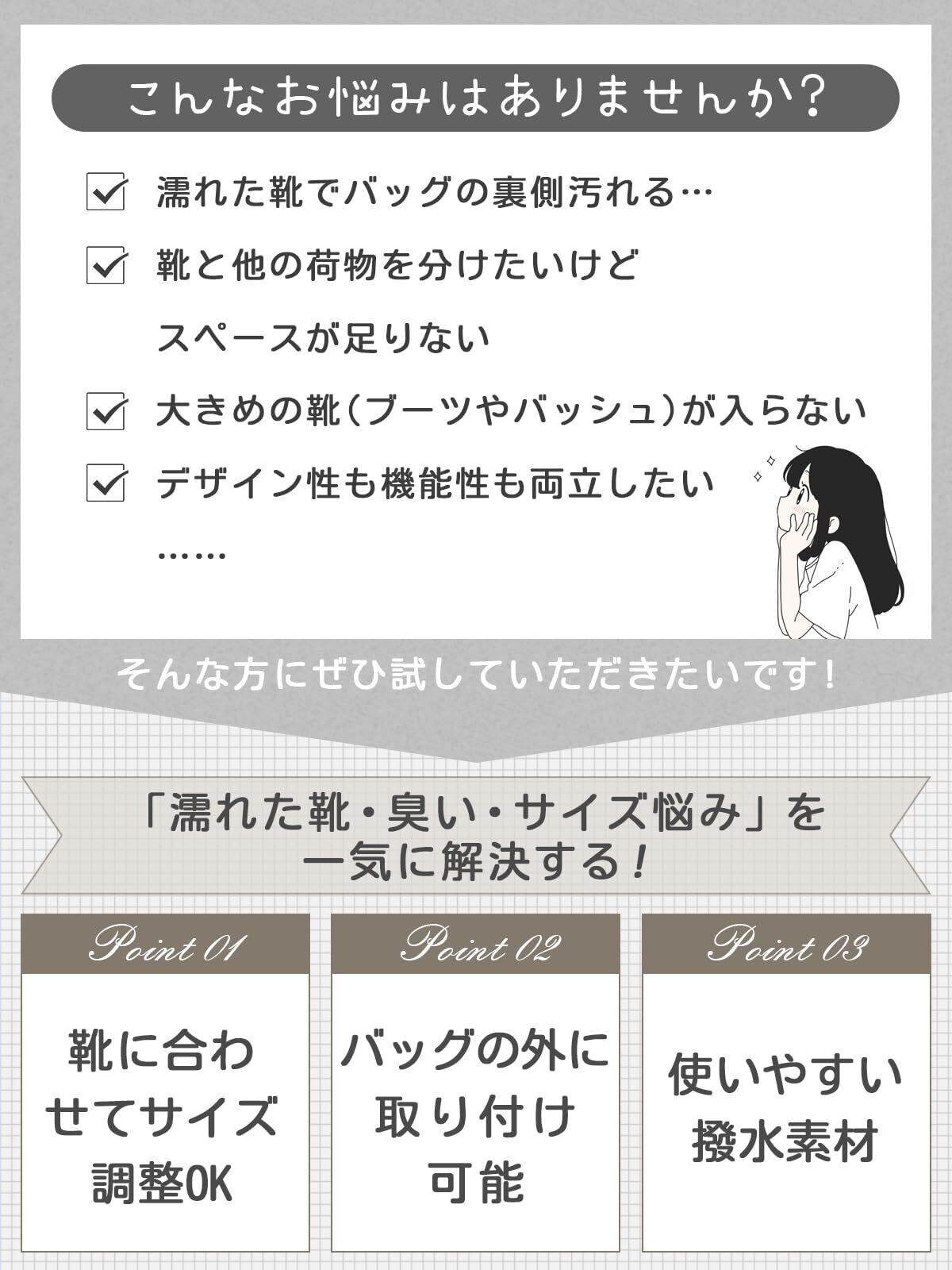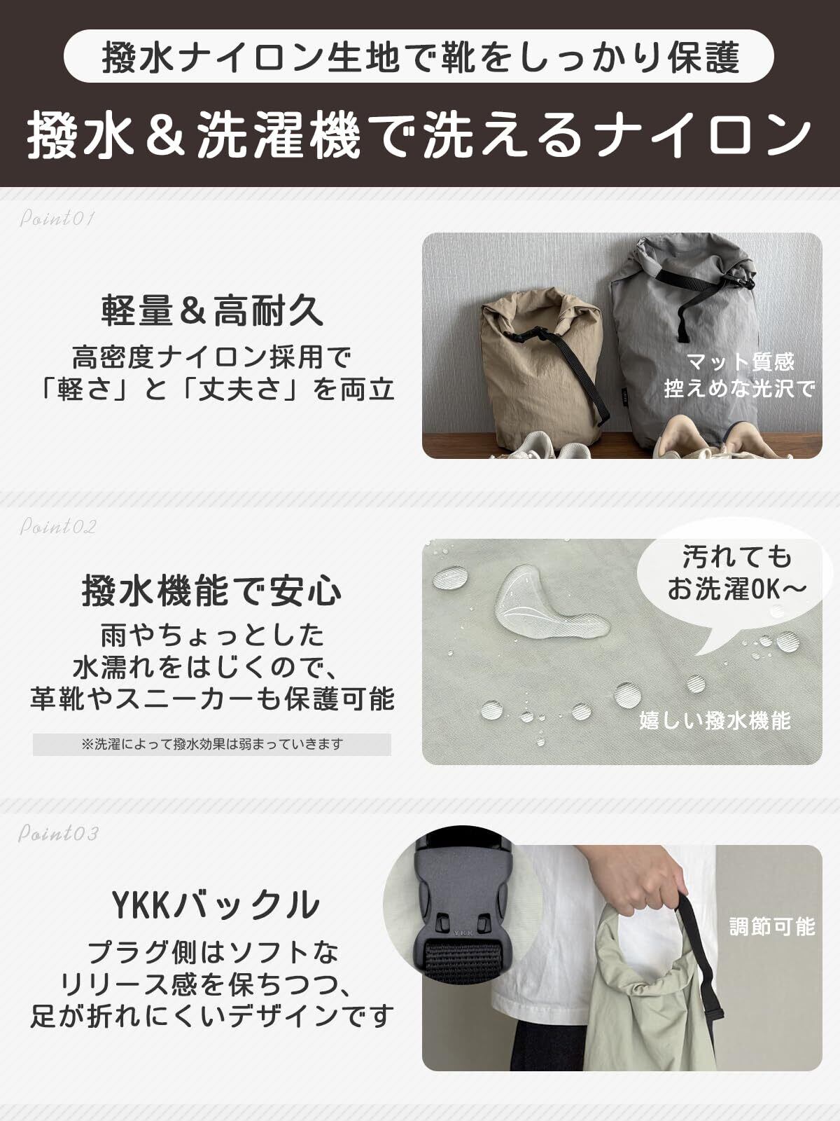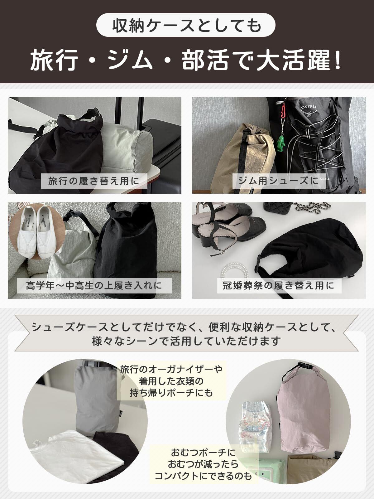 【バッグに取り付け可能な便利なデザイン】YKK製高品質バックル採用で耐久性◎バックルをカバンやリュックのハンドルに掛けて外付け可能。荷物が多い時や靴を別で持ち歩きたい時に便利です。【旅行・ジム・日常使いまで大活躍】靴の持ち運びが必要なあらゆるシーンで便利。収納ケースとして小物入れにも使え、小学生から大人までユニセックスで利用可能です。