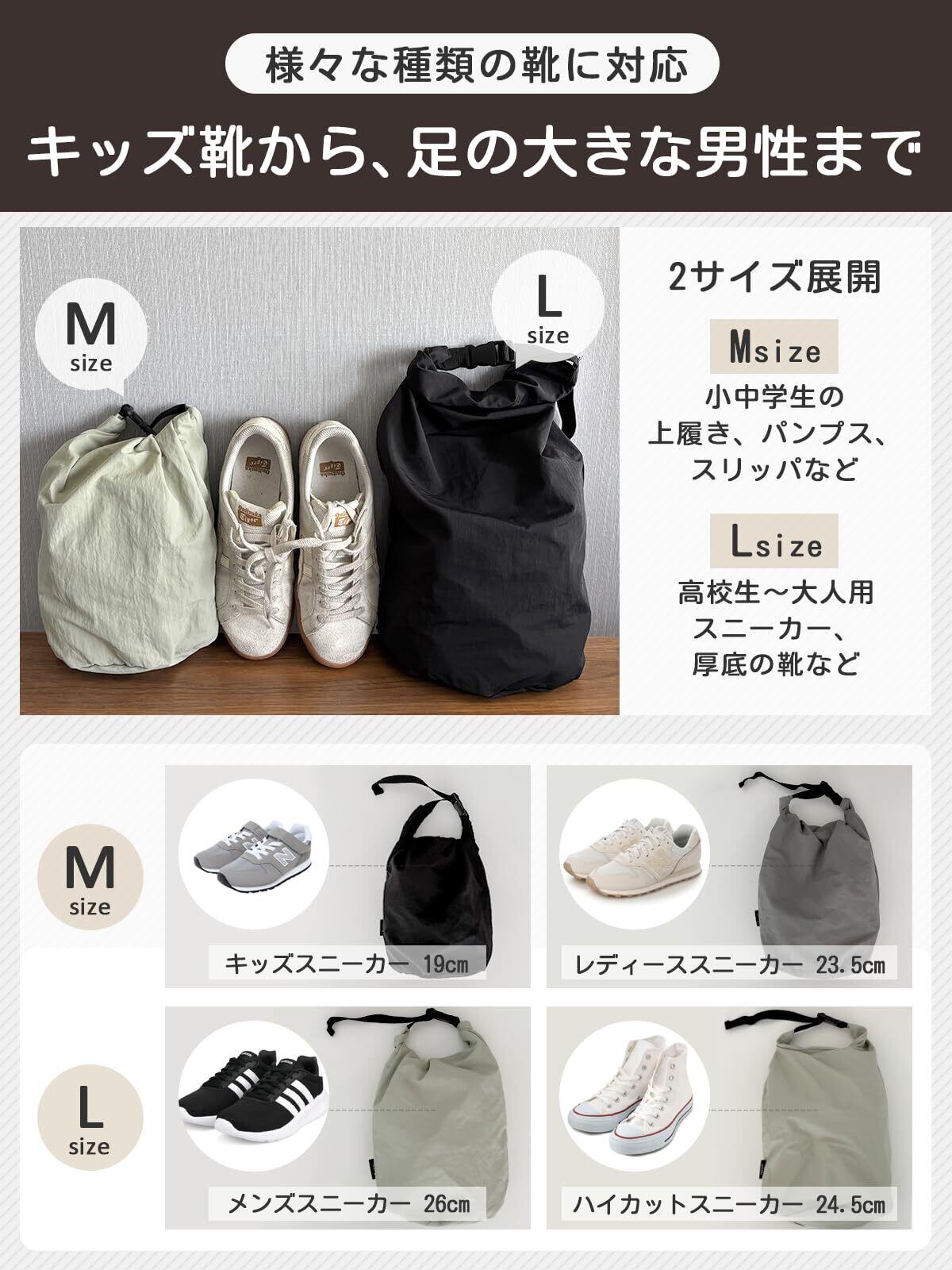 【2サイズ展開でさまざまな靴にフィット】MサイズとLサイズの2種類を用意(Mサイズ: 子供用~女性用/Lサイズ: 男性用~大きな靴)。スニーカーや革靴など、幅広い靴を収納可能。※高さのある靴は、裏同士を交互に合わせると入れやすくなります。【5色展開】黒/灰色/薄緑/パープル/駱駝色(焦茶)/梅鼠のシンプルで使いやすいデザイン。家族で色分けしても。