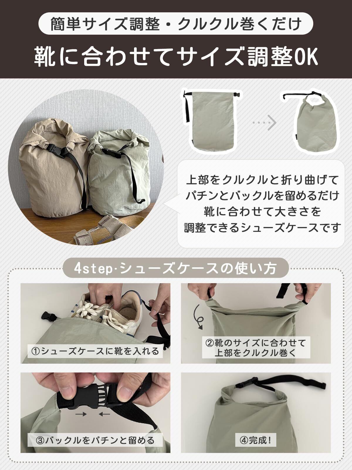 【サイズ調整可能でコンパクト】上部をクルクル巻いてバックルで留めるだけで、靴にぴったりフィットするサイズに調整可能。余分なスペースがなくなり、バッグ内でもかさばらず、キッズ靴から大人用まで幅広く対応します。