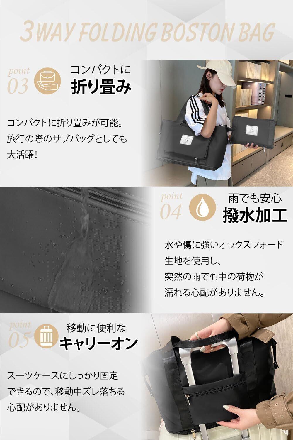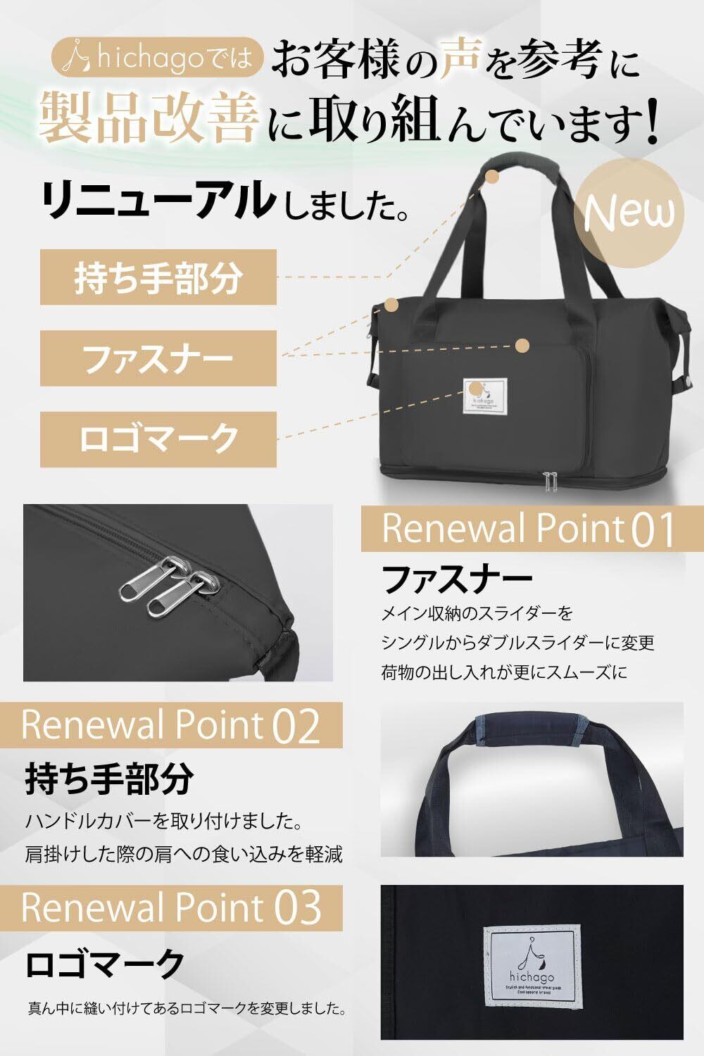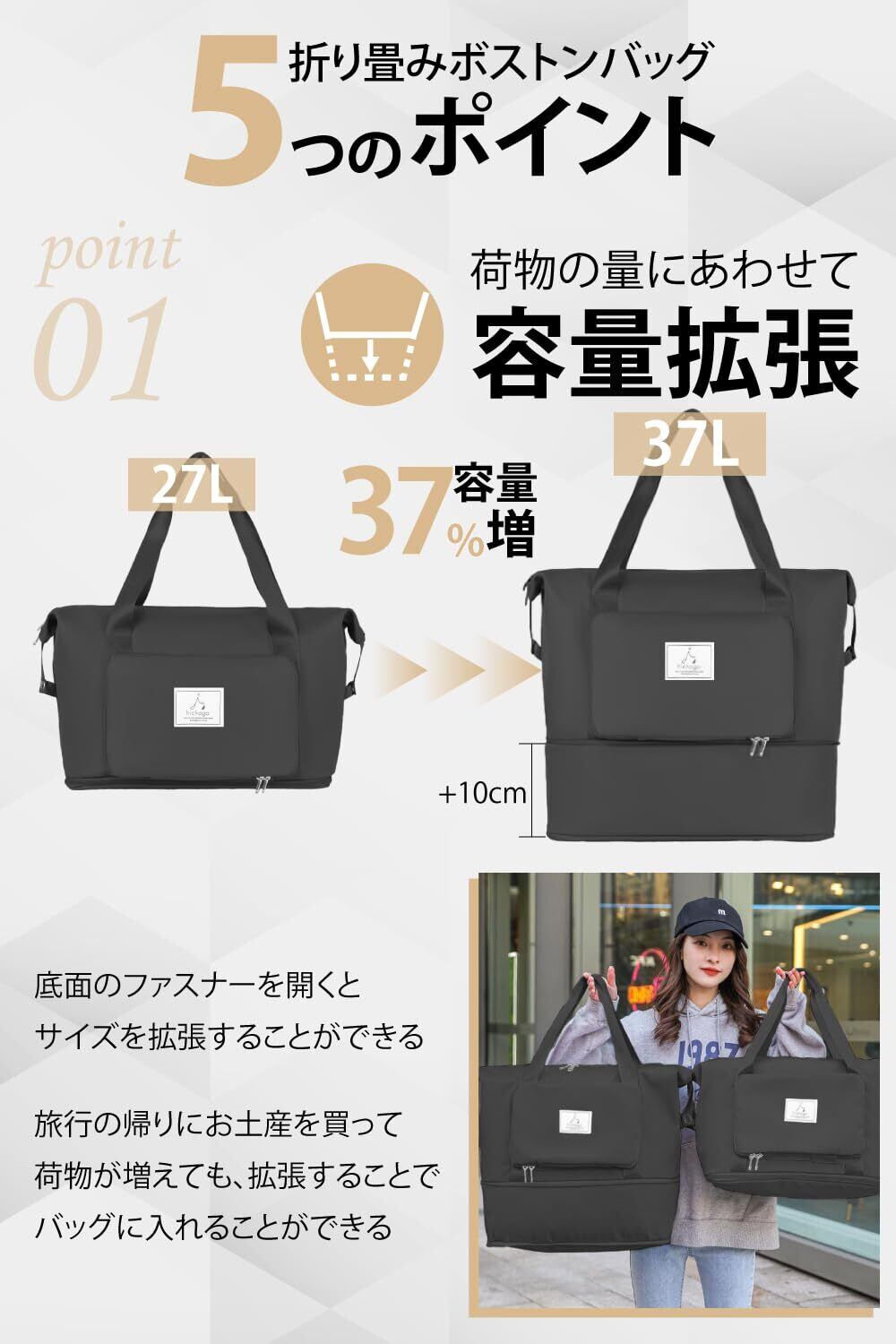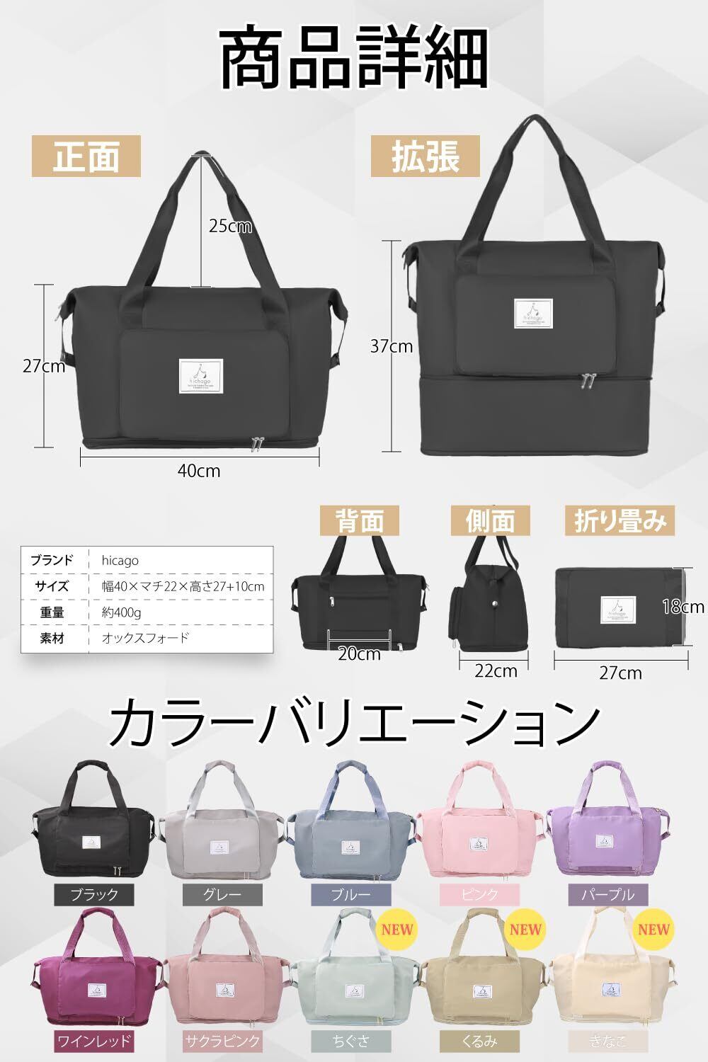 hichago ボストンバッグ 【折りたためる】 大容量 拡張 軽量 旅行 修学旅行 メンズ レディース キャリーオンバッグ サブバッグ