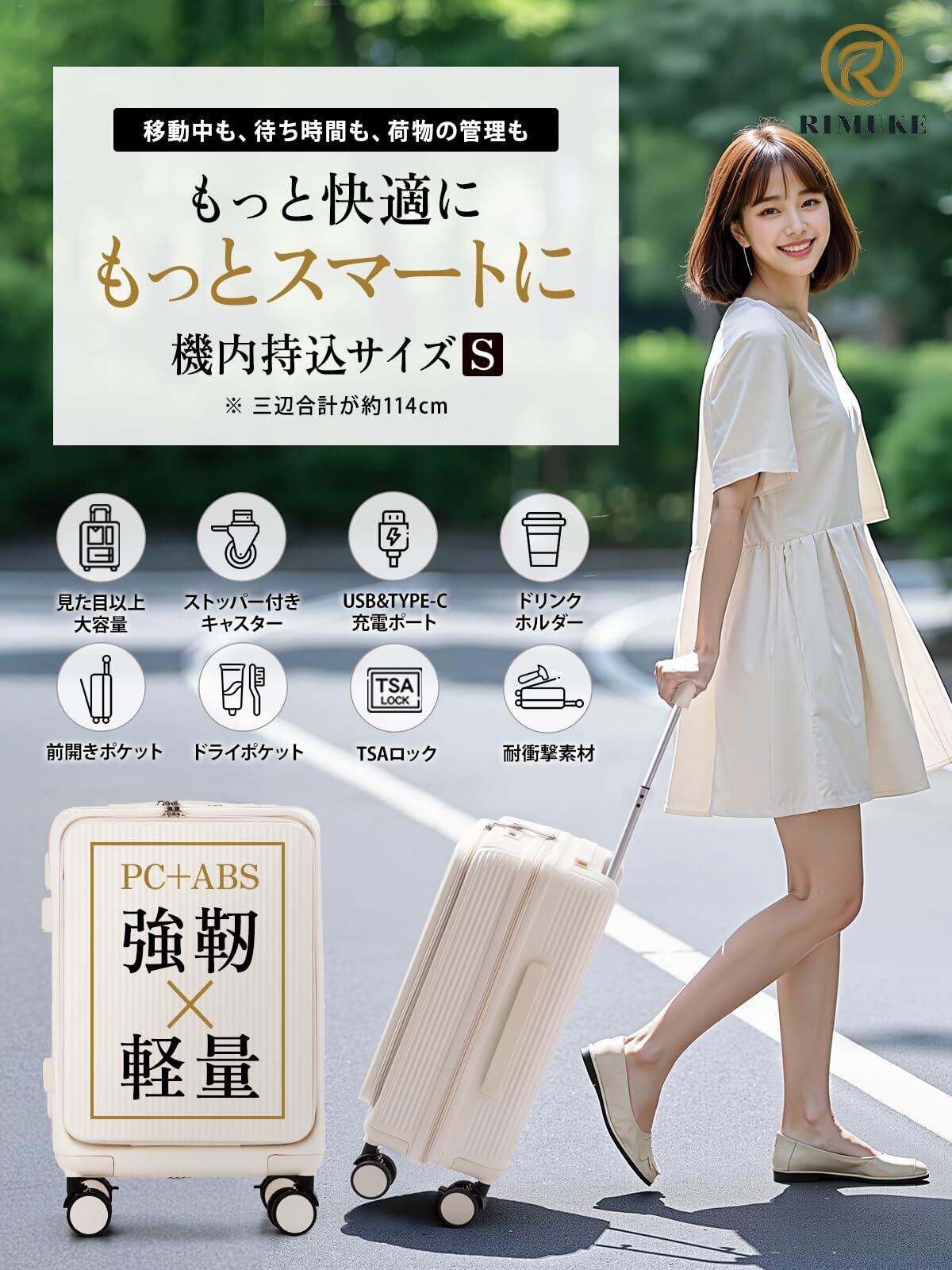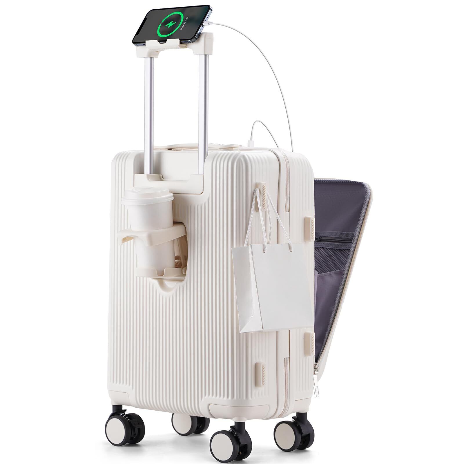 [RIMUKE] 前開き スーツケース 機内持ち込み キャリーケース パソコン収納ポケット USBポート付き カップホルダー付き キャリーケース 超軽量 360度回転 耐衝撃 ック 静音 旅行 ビジネス 出張 1泊2泊3泊 ホワイト