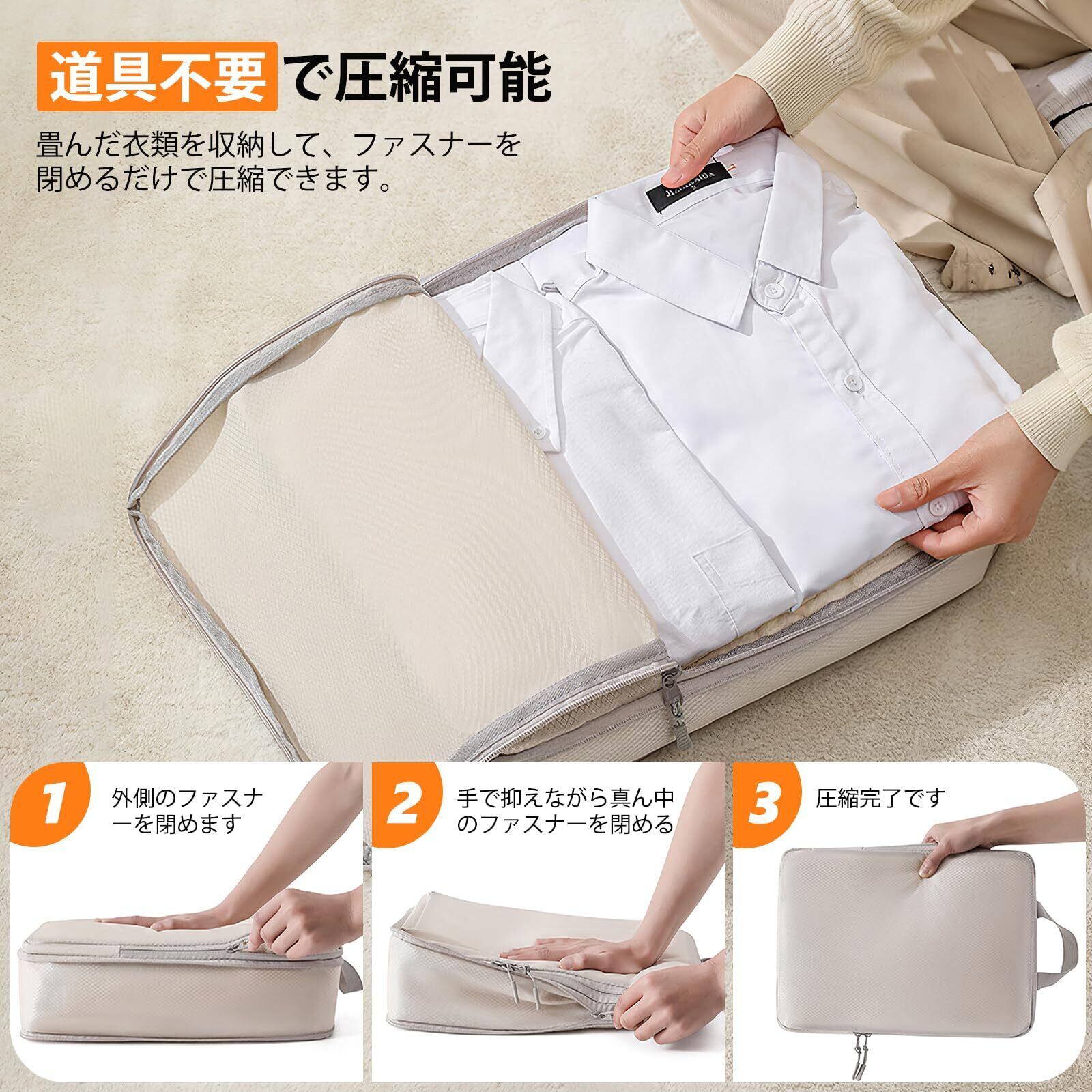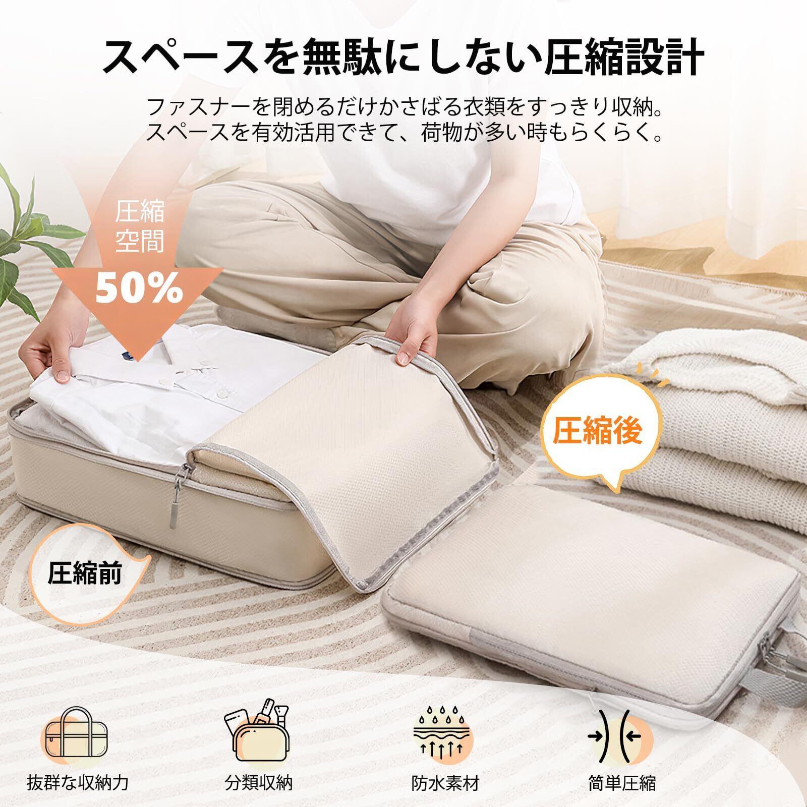 【簡単圧縮&50%スペース節約】圧縮用の吸引機などは不要で、ファスナーを閉めるだけで簡単に衣類を圧縮できるトラベルポーチです。2つの圧縮ジッパーを採用して、衣類スペースをより多く節約でき、約50%節約することができます!かさばる衣類や荷物を圧縮して、スーツケース内がすっきり整理整頓されます。