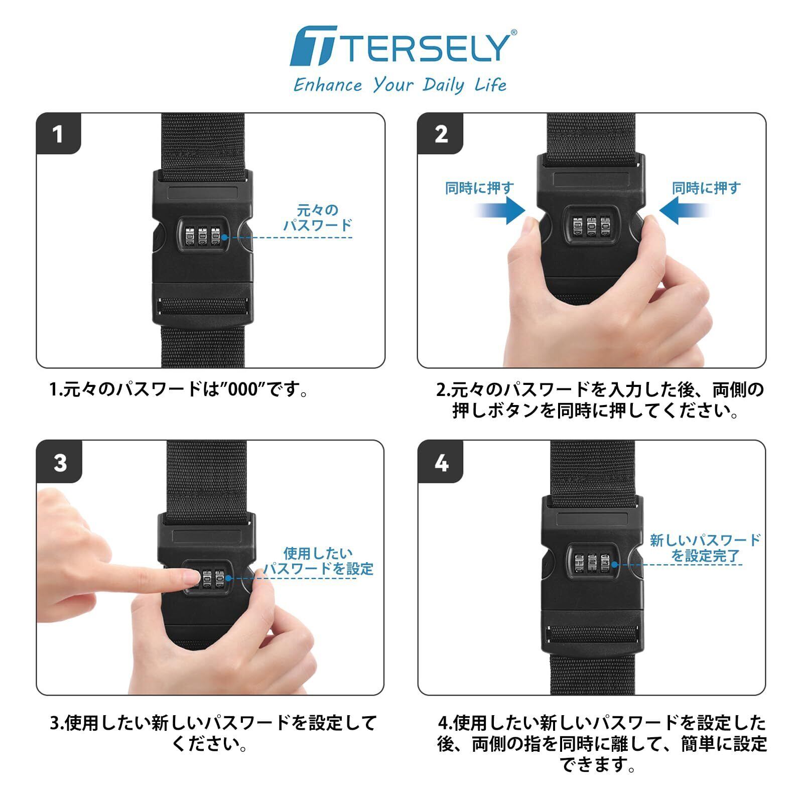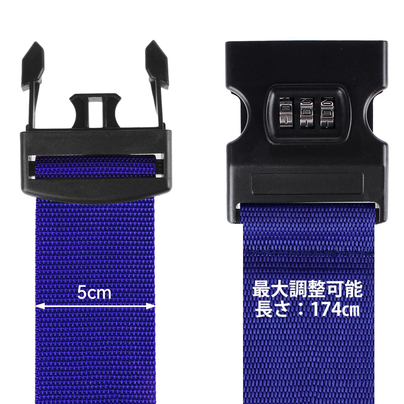 「長さを自由に調節可能」T Terselyのキャリーケースベルトの長さは最大174センチメートル(バックルがロックしない場合)に調節可能です。ほぼすべて市販しているスーツケースを適用できます。幅さは5センチメートルで、もっとしっかりに荷物を守ります。2本セットので、横と縦を別々に固定して、2重保護を満たします。
