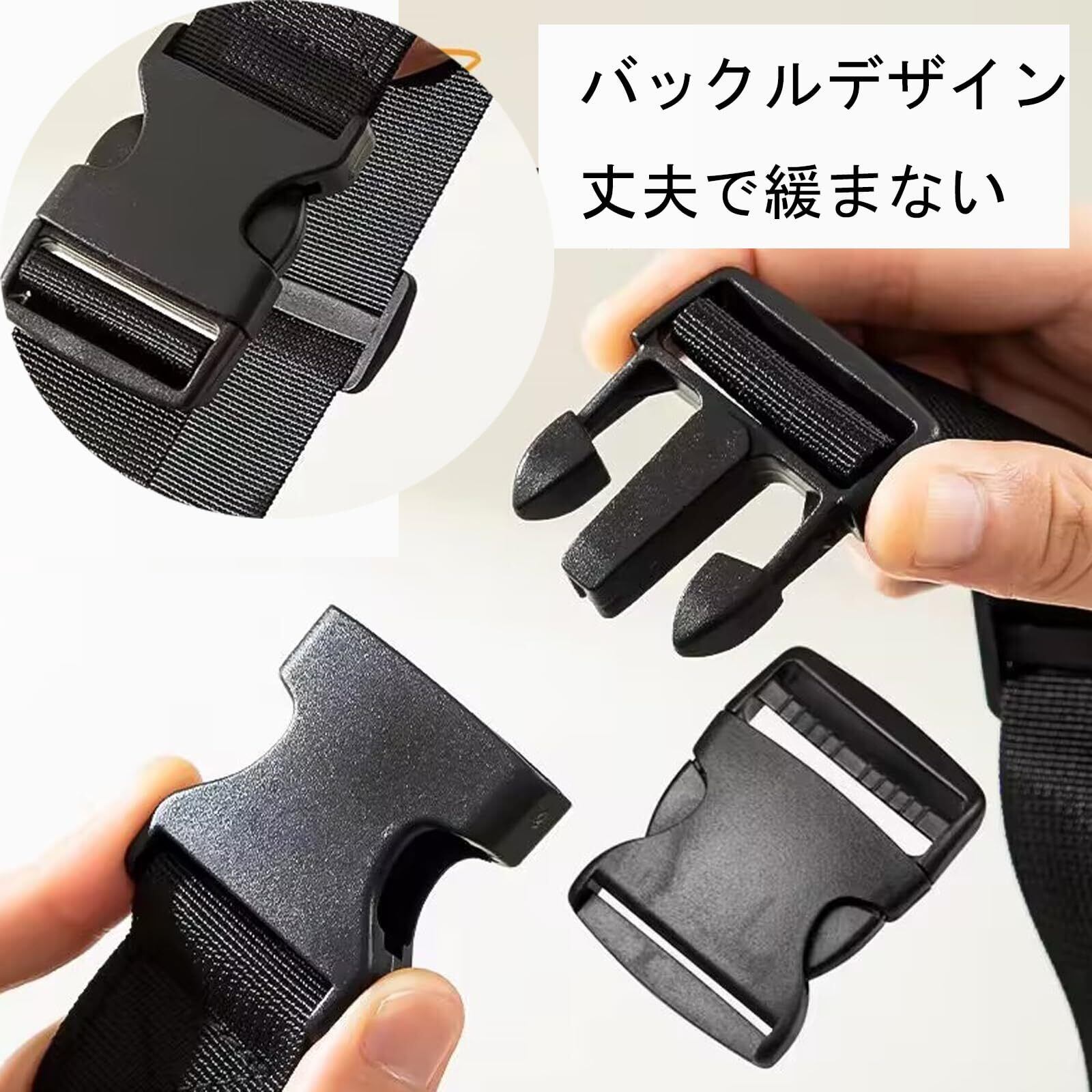 【安心】ストラップの長さはボタン一つで調整でき、縦だけでなく横にも使用できます。高い強度に耐えるラゲッジストラップは、不意の開口部からの荷物の飛び出しを防ぎ、移動中の安全を守ります。