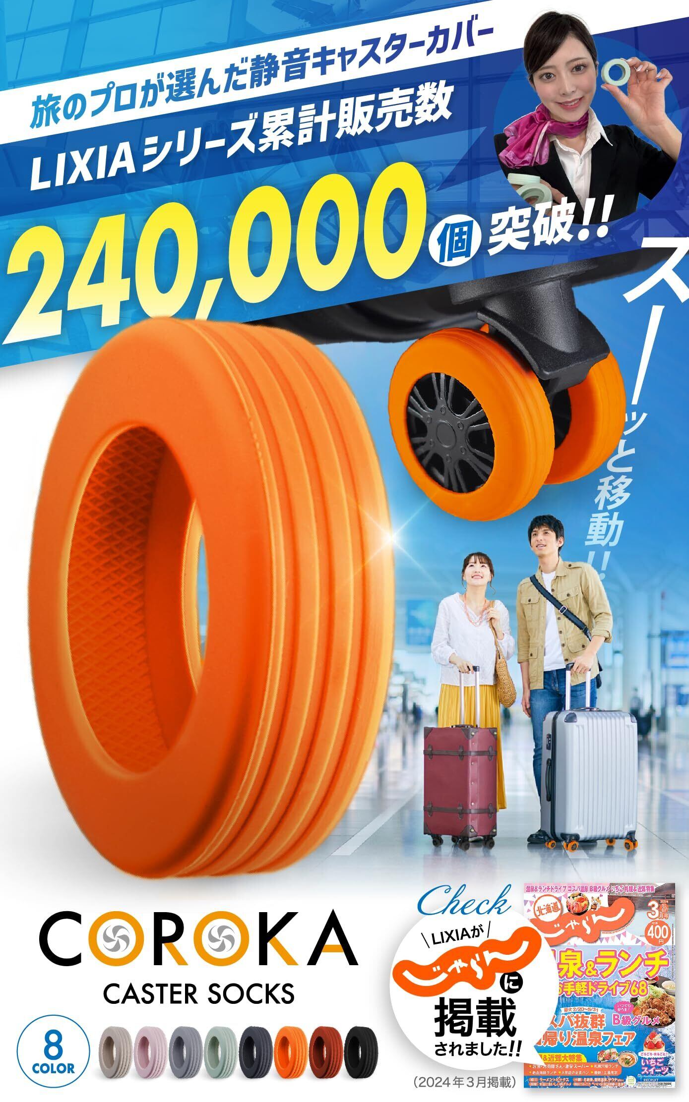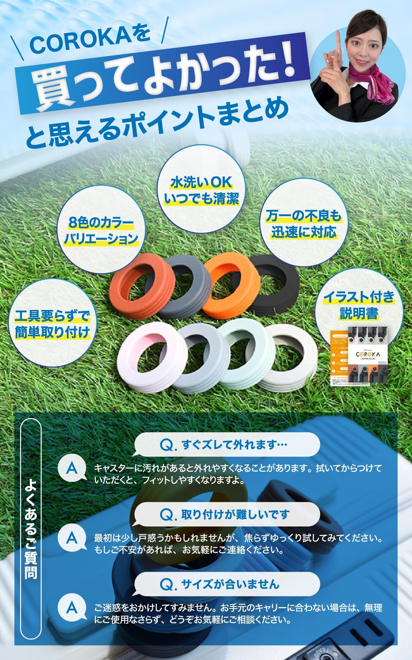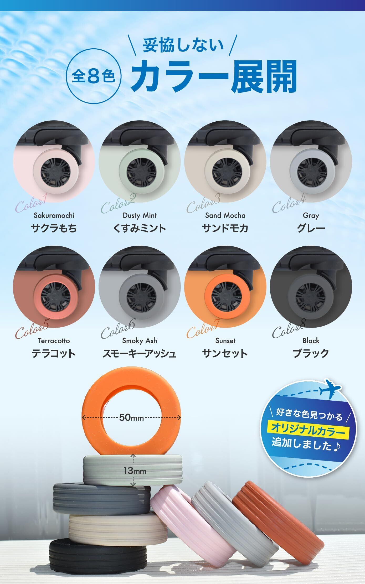 【 カラーバリエーション全8色 】 「サクラもち」や「くすみミント」などのニュアンスカラーから、「ブラック」「グレー」といった定番色まで全8色を展開。 スーツケースの雰囲気に合わせて選べるだけでなく、キャスターを彩るアクセントとしても楽しめます。実用性+デザイン性を兼ね備えたおしゃれなトラベルアイテムです。