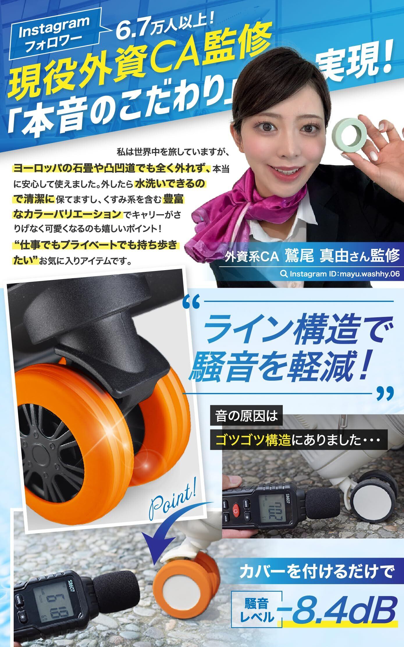 【 静音設計 】 スーツケースを引くときの「ガラガラ音」を独自のライン構造で吸収・分散し、静かな走行を実現します。 カバーを装着するだけでキャスター音が約 -8.4dB 軽減され、空港や駅、マンションのエントランスなど、周囲を気にする場所でも安心。深夜や早朝の移動時に「音が気になる…」という悩みを解消します。