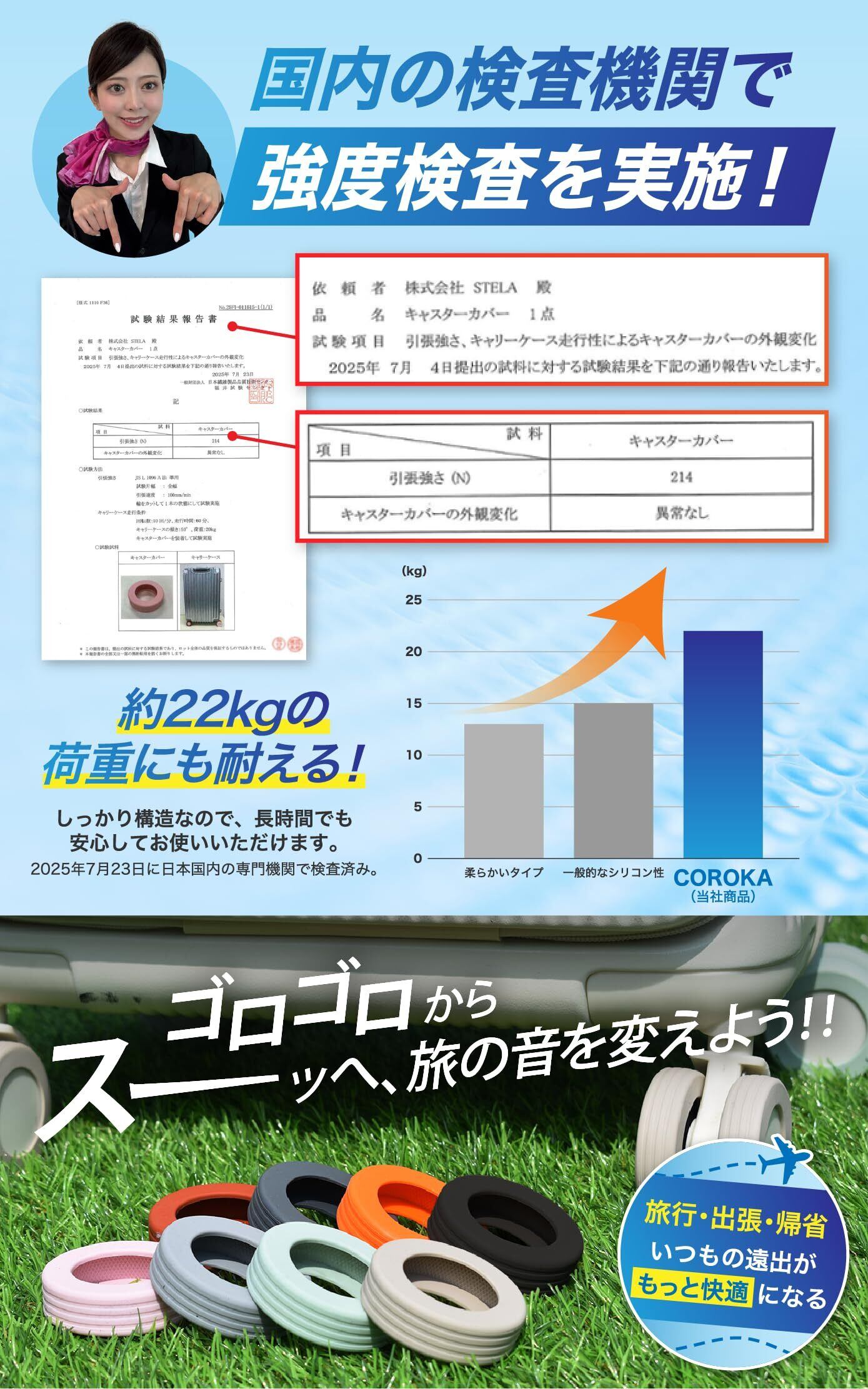 【 耐久テスト済み 】 国内の検査機関で強度試験を実施し、約22kgの荷重に耐えることが確認済み。重い荷物を入れたスーツケースでも安心して使用できます。 長時間の移動でも壊れにくく、旅行・出張・帰省など幅広いシーンで頼れるアイテムです。