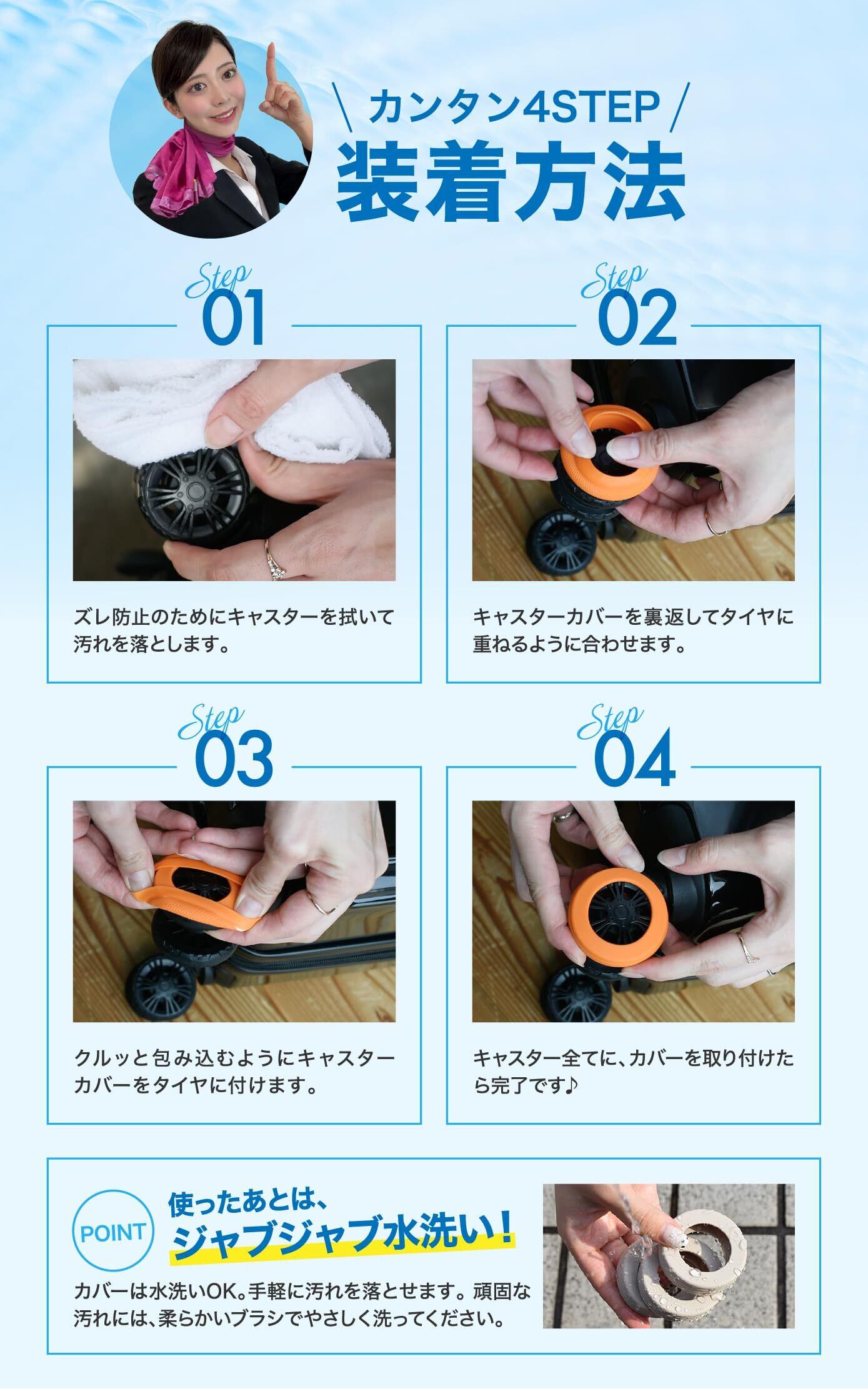 【 簡単4ステップ装着 】 工具不要で誰でも簡単に取り付け可能。 1.キャスターを拭いて汚れを落とす 2.カバーをひっくり返してタイヤに合わせる 3.包み込むように装着 4.全体を整えて完成! 出発前にサッと取り付けるだけで、快適な旅をサポートします。