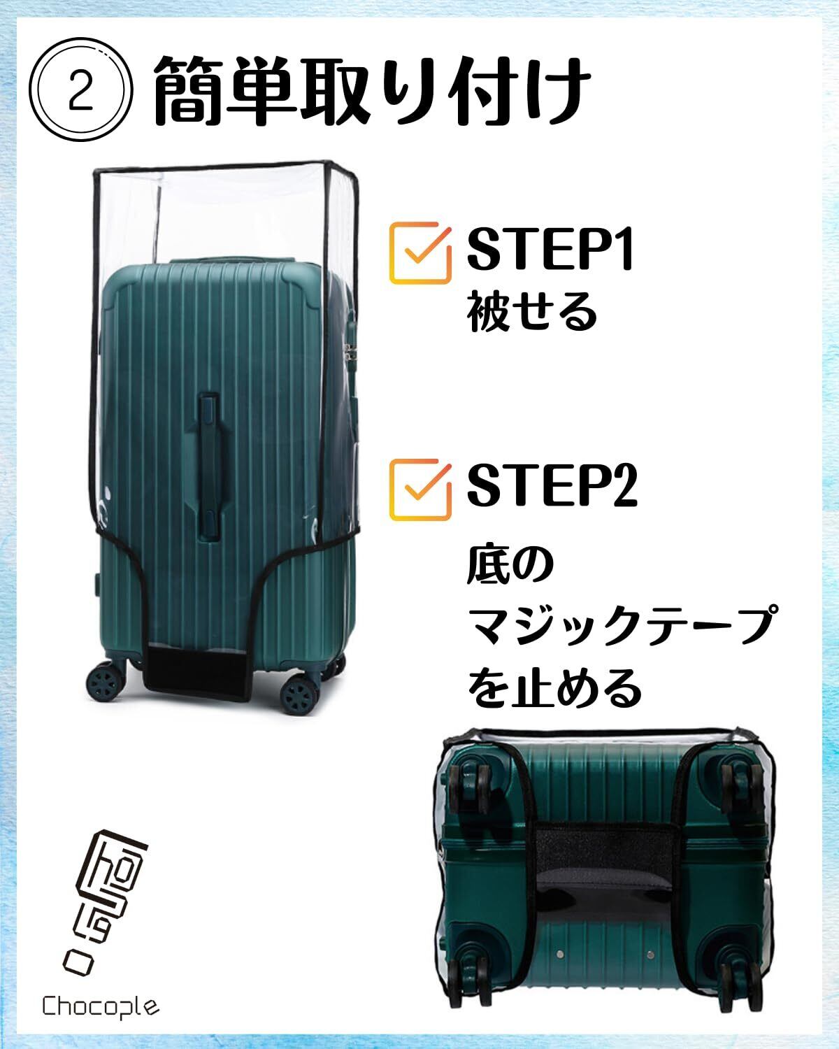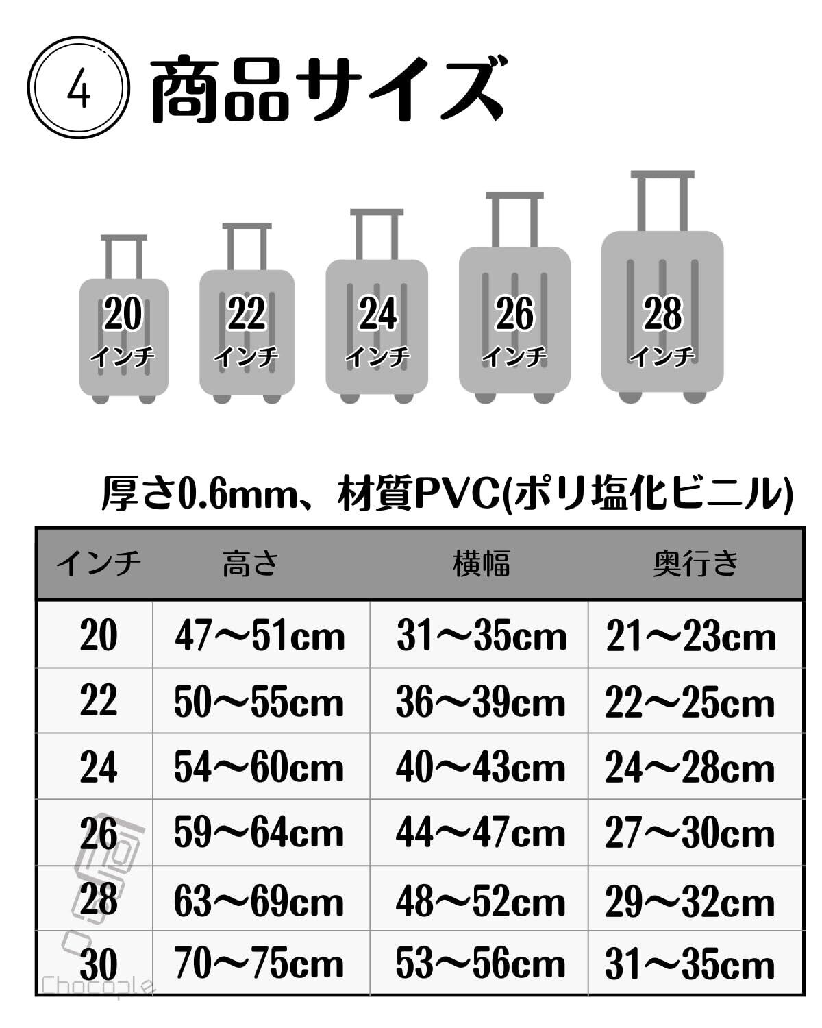 【傷や汚れ、雨水の対策に】スーツケースやキャリーバッグの傷や汚れ、雨の日の対策として効果的なスーツケースカバーです。【簡単取り付け】スーツケースに被せるだけの簡単設置です。底にマジックテープを貼り付けるだけです。【ハンドル部分は貫通穴有り】上部のハンドル、けん引ハンドル、側面ハンドルは貫通穴があります。【商品詳細】材質:PVC(ポリ塩化ビニル)、サイズ:画像参照(20インチから30インチ)、厚さ0.6mm【安心の30日間保証】商品品質には万全を機しておりますが、万が一初期不良等発生した場合はご購入から30日間に限り新しい商品と交換対応いたします。Chocopleオリジナル梱包にて倉庫から迅速にお届けいたします。