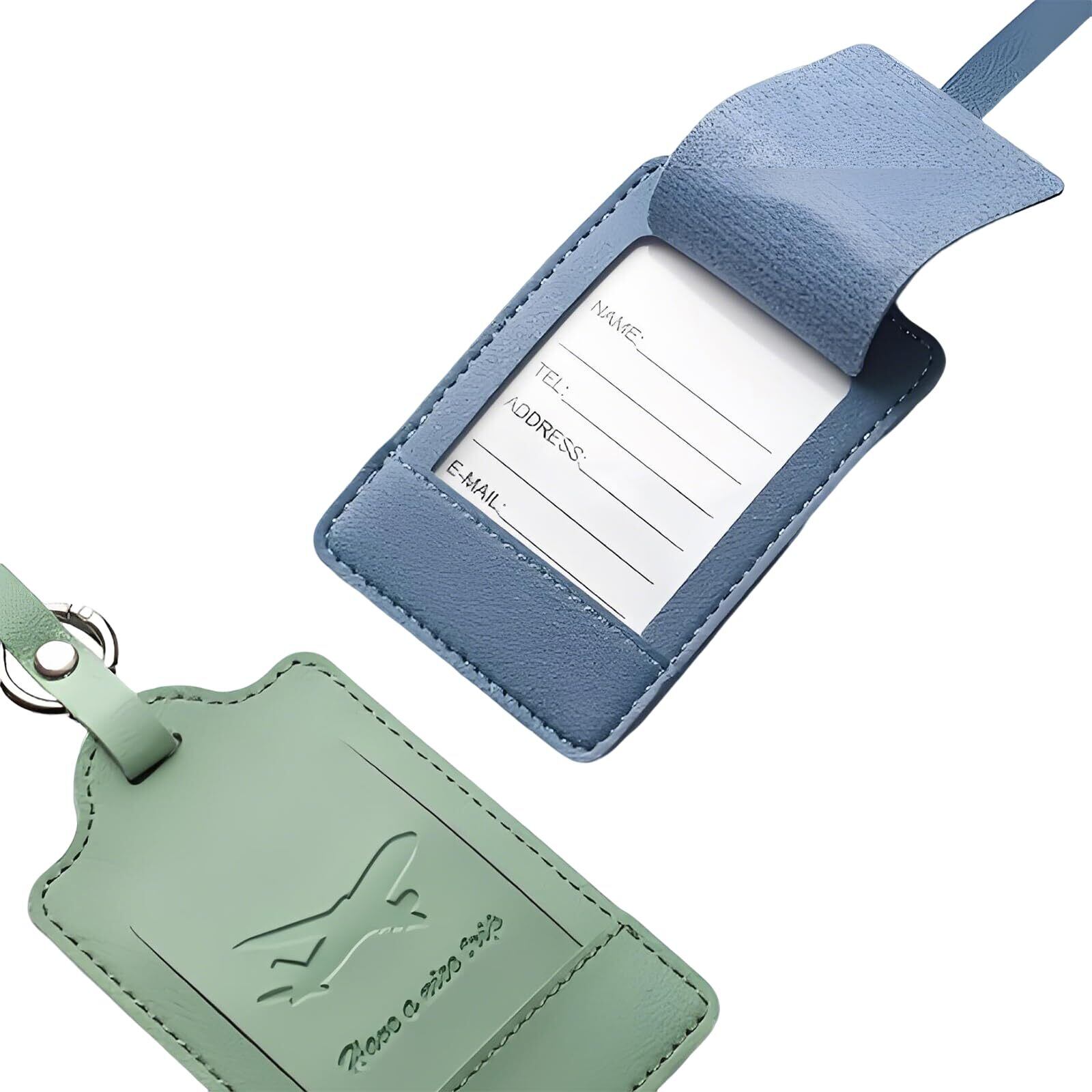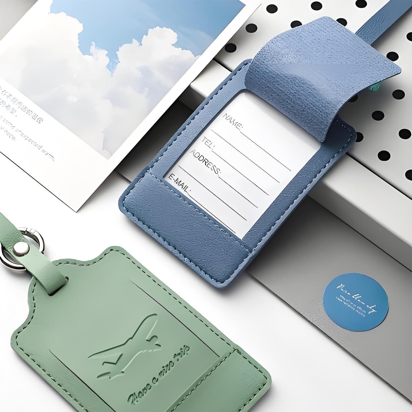 【商品詳細】 ラゲッジタグは PU レザー製の丸型デザインで、ネームタグとして適した仕上がりです。カラーはスカイブルーとライムグリーンの組み合わせで、視認性が高くまとまりやすいです。