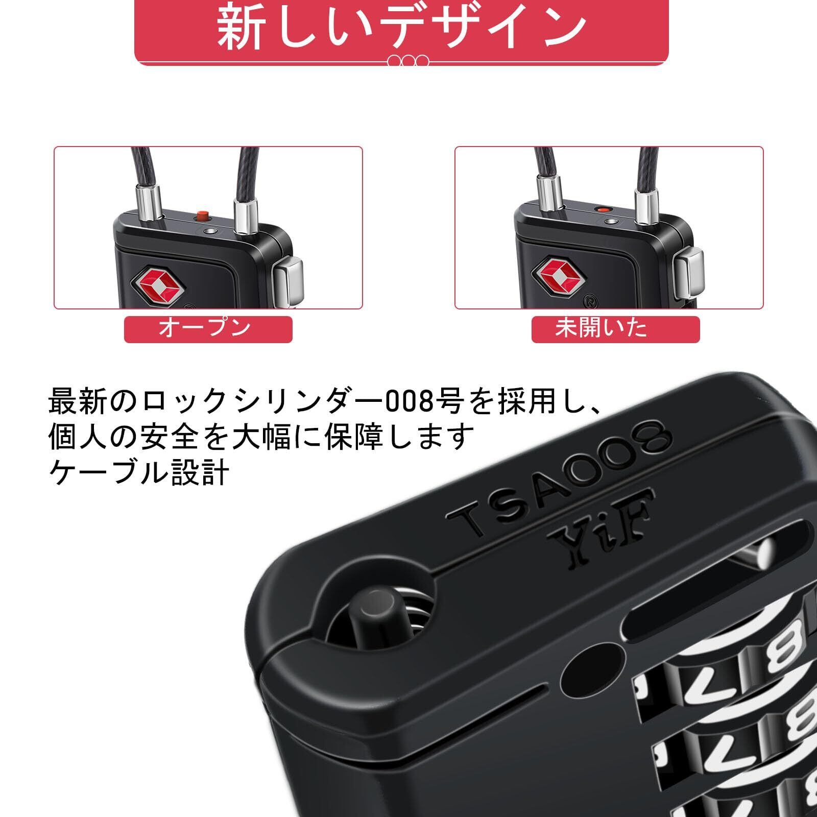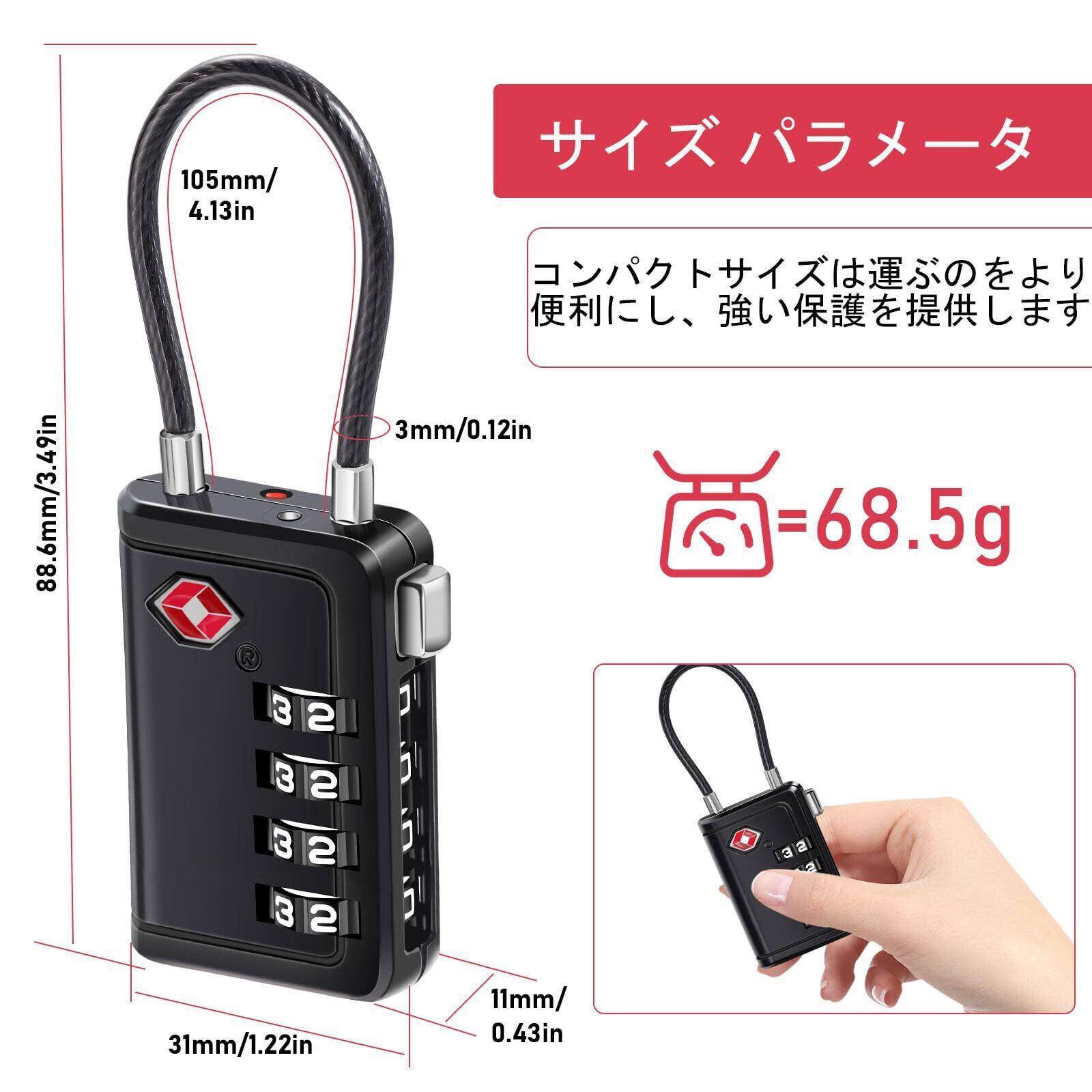 特徴 TSA認証, パスコードロック解除, リセット可能, 耐切創性, 耐引っかき性