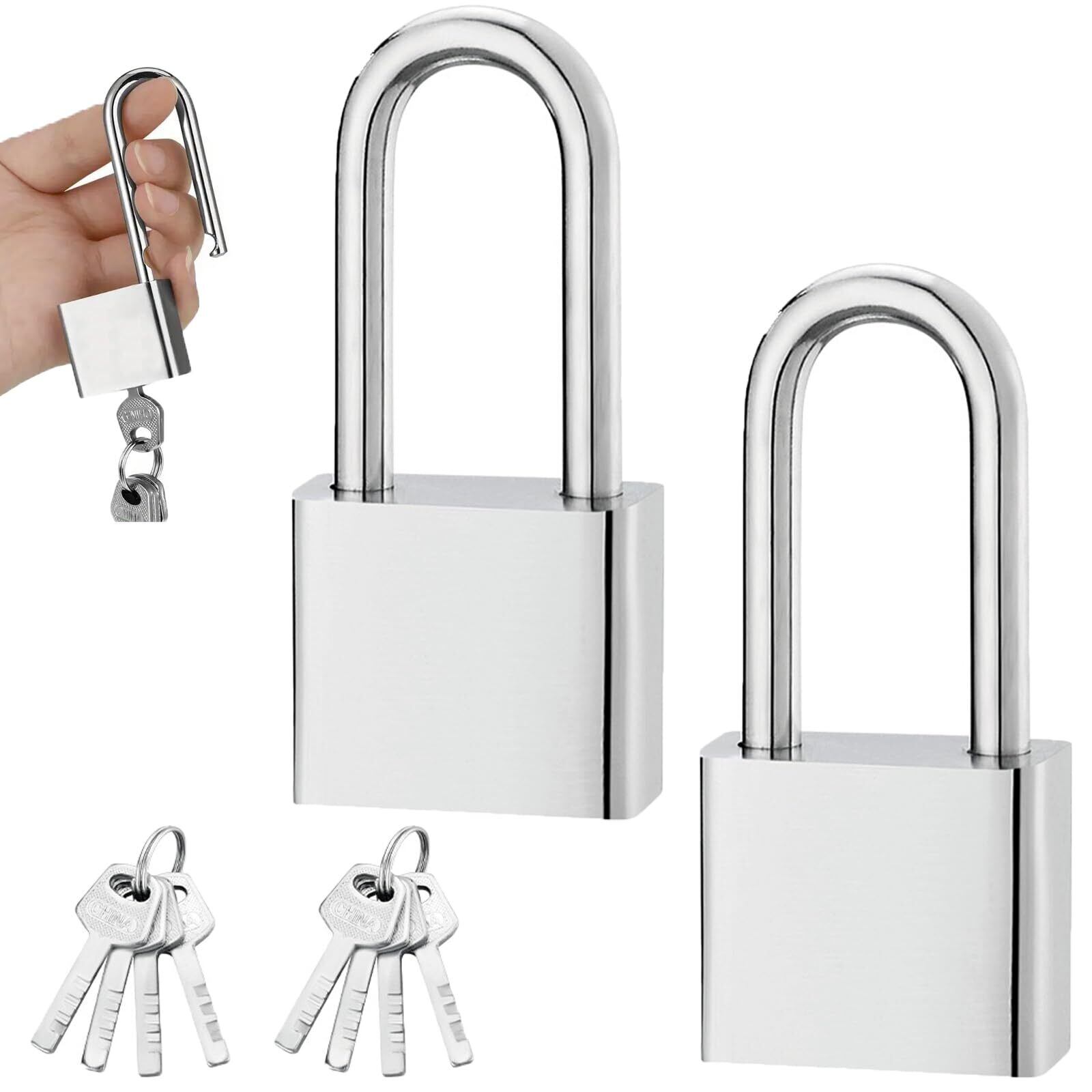 JUJUGO 南京錠 小型 鍵付き 2個セット シルバー 防錆加工 防水 耐久設計 鍵8本付属 (ロングシャックルタイプ) 自宅 工場 アウトドア用 セキュリティロック