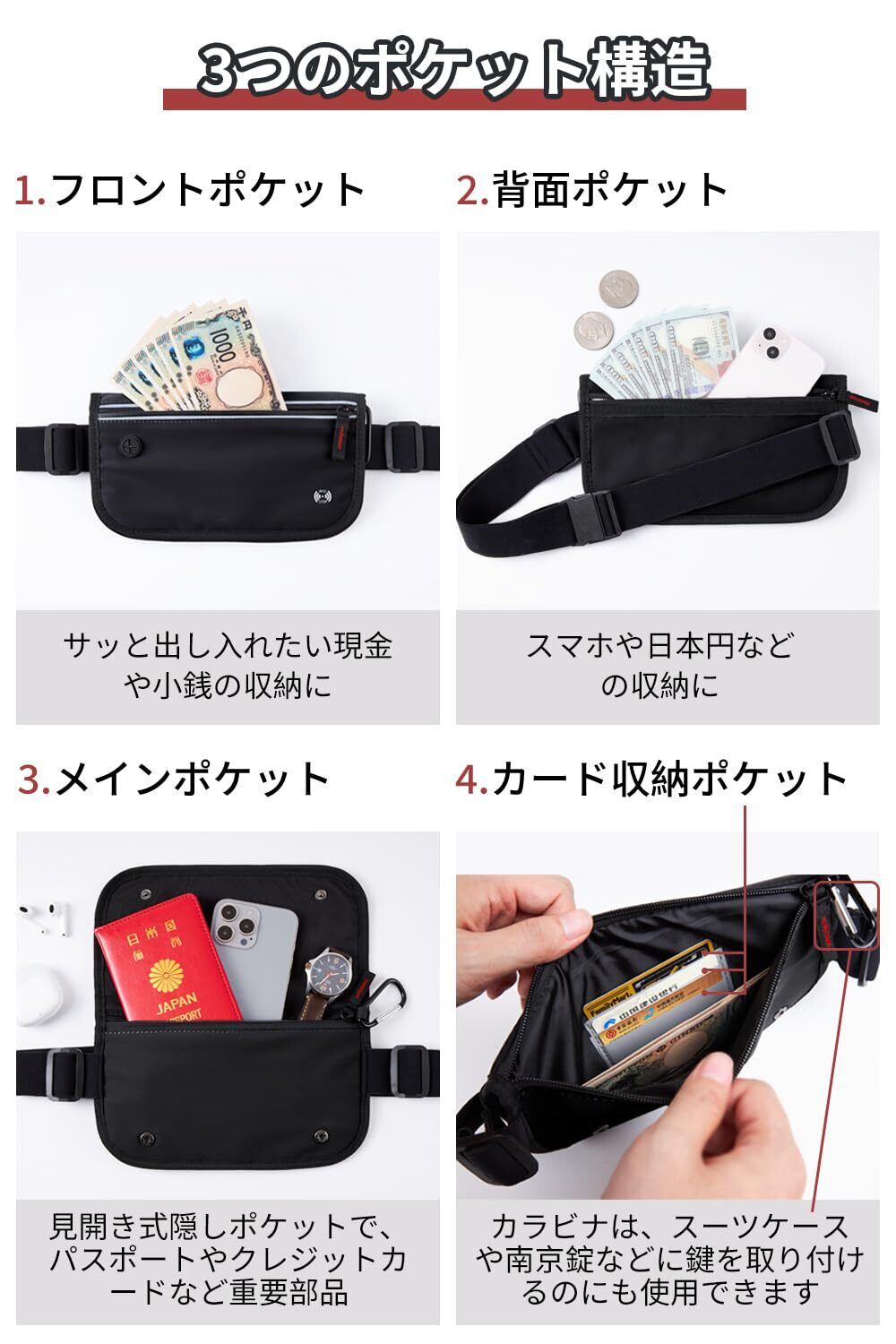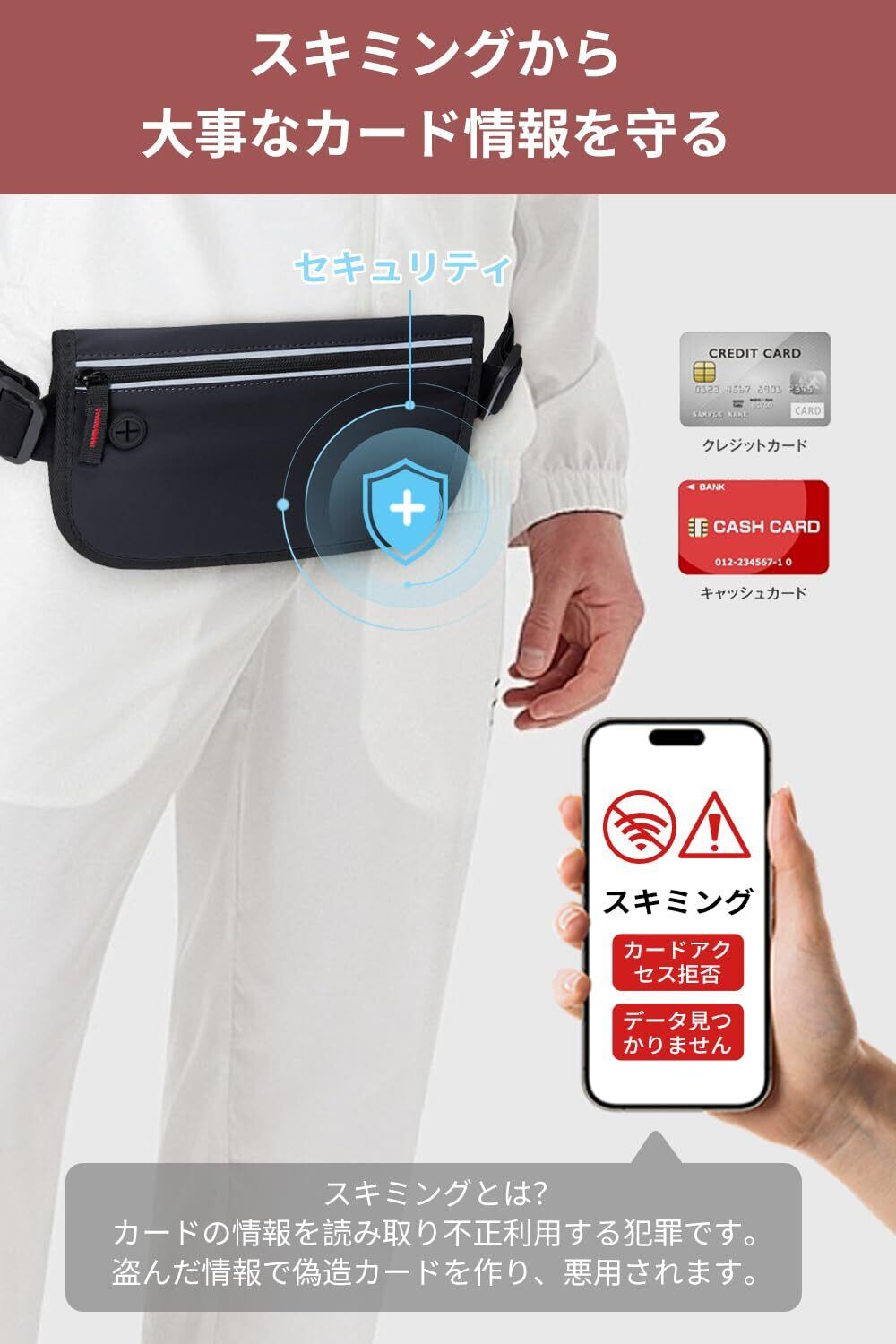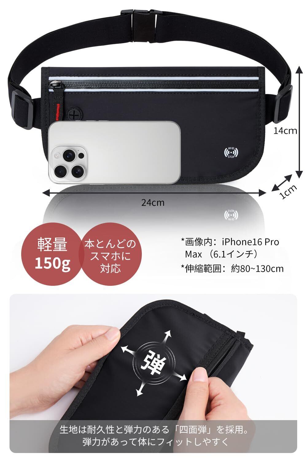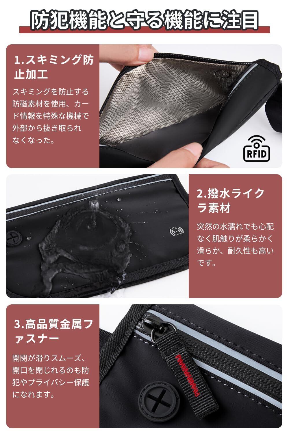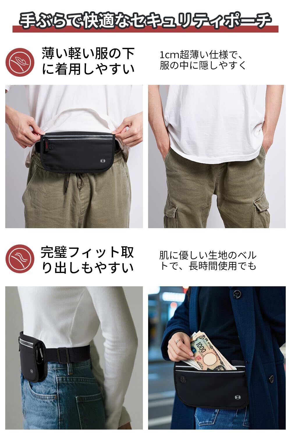 【超薄設計で防犯効果抜群】薄型・軽量で、薄着になる夏でも服の下に忍ばせやすいRFIDスキミング防止機能搭載の薄型ウエストポーチタイプ、外からは見えません。カード類の収納も安心。人員混雑した観光地、公共交通機関での防犯対策に最適です。観光地で写真を撮る際や、公共交通機関での移動中でも、貴重品を安全に持ち運び、盗難のリスクを大幅に軽減します。