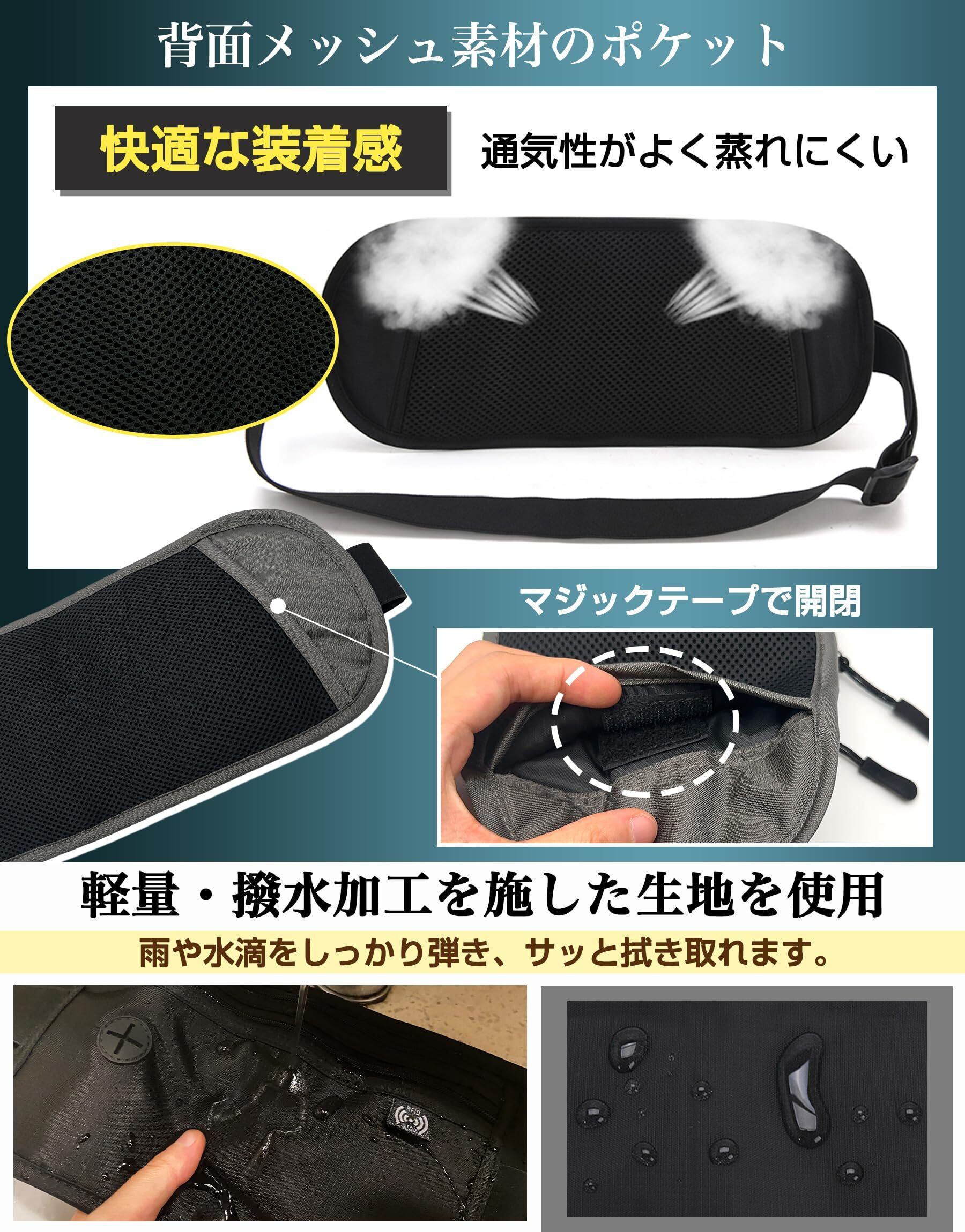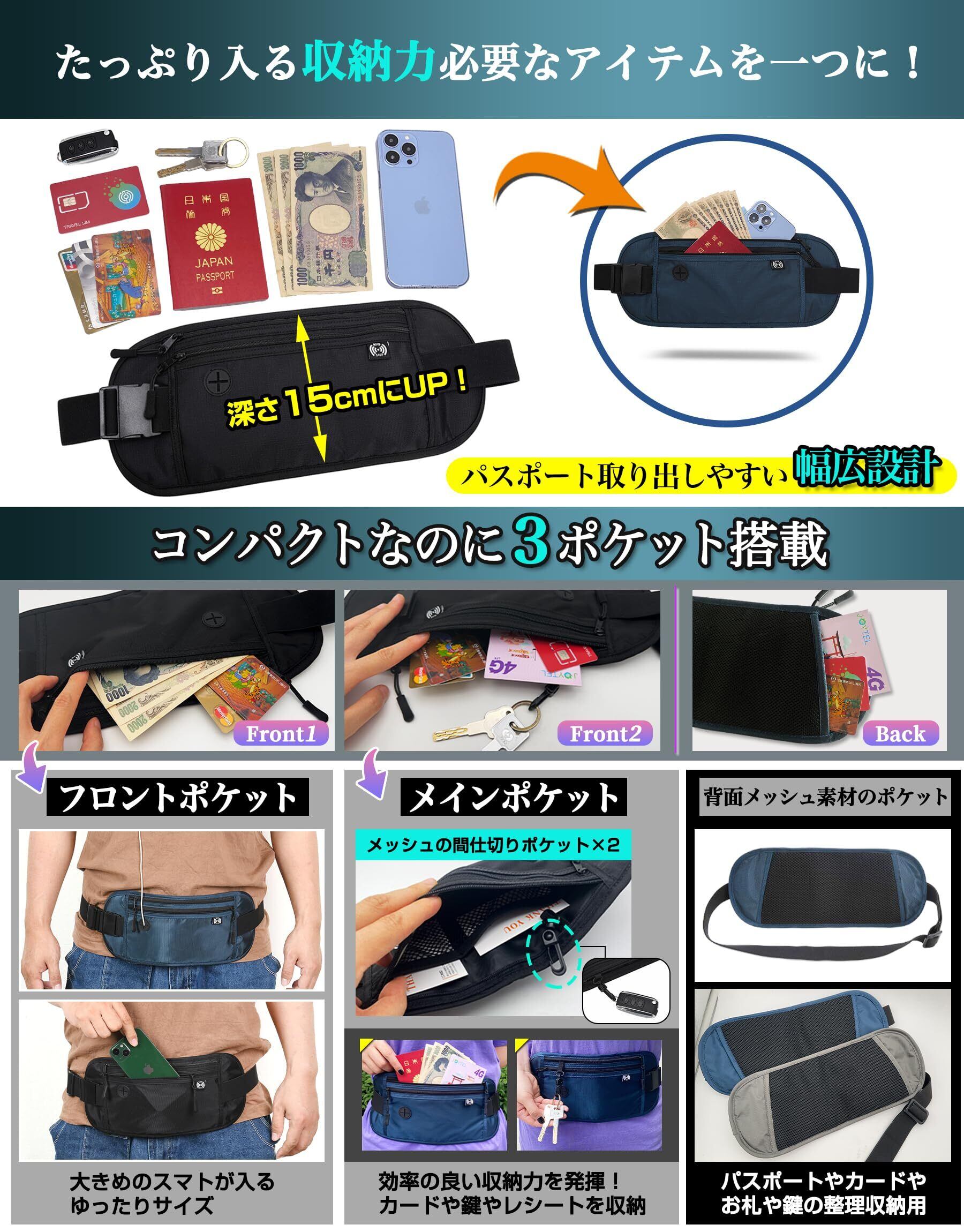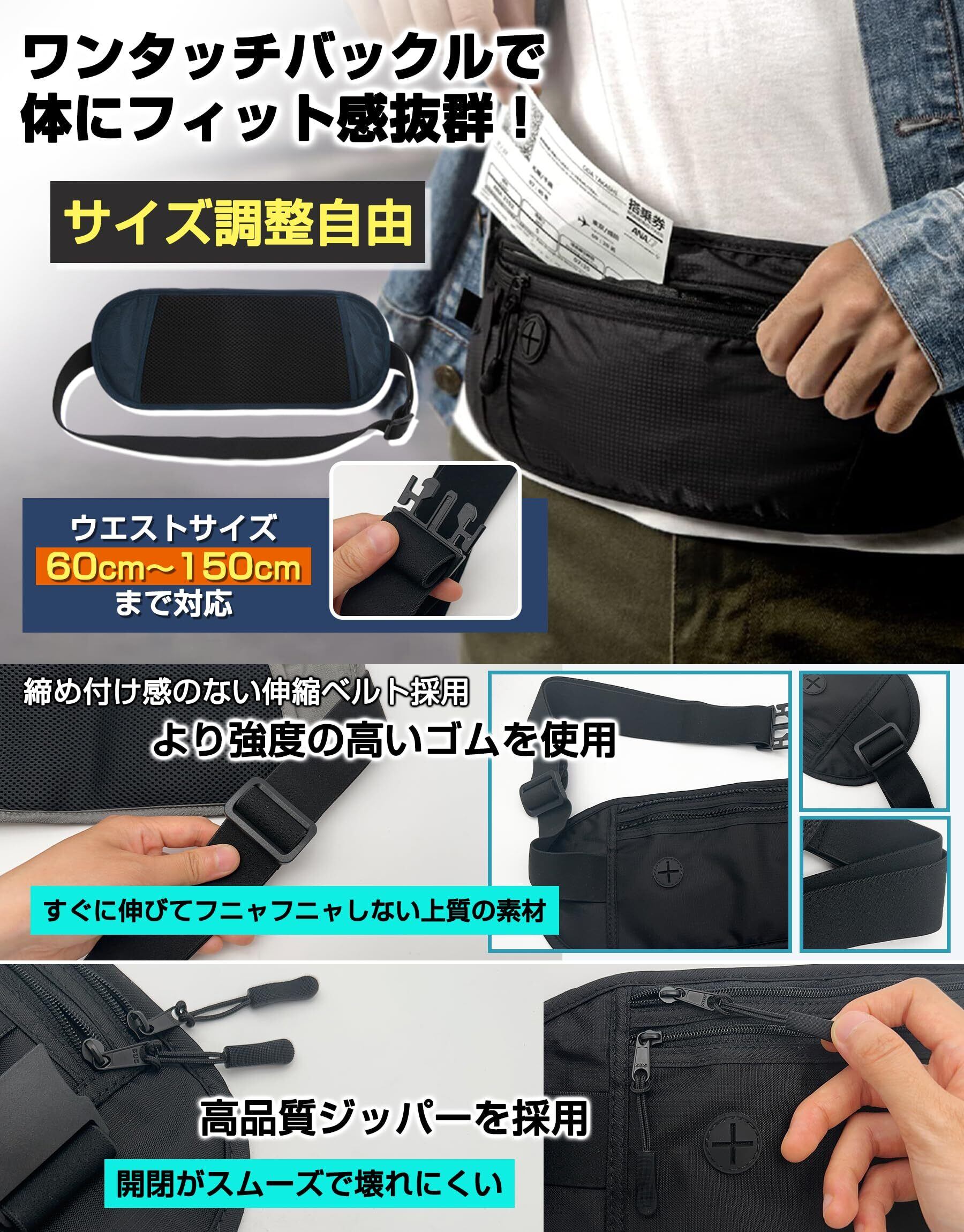 【3ポケット搭載・便利性抜群】コンパクトなのにたっぷり入る収納力!深さ15cmのメインポケット(パスポート取り出しやすい幅広設計メッシュの間仕切りポケット×2 カードや鍵やレシートやお札を収納しやすい)、フロントポケット(大きめのスマトが入るゆったりサイズ)、背面メッシュポケット(通気性がよく蒸れにくい、マジックテープで開閉)の3つの充実した収納ポケット仕様。体に身に付けて貴重品を持ち運びできて、旅行経験豊富なスタッフチームにより考え抜かれたレイアウト。必要な物を十分に収納、小分けしやすく、必要なモノもサッと取り出せ、使い分けができてとっても便利!サイズ:(約)縦15cm × 横35cm × 厚さ0.8cm 重さ:約120g ウエストサイズ:60cm~150cmまで対応 ※SIMピン2個附属