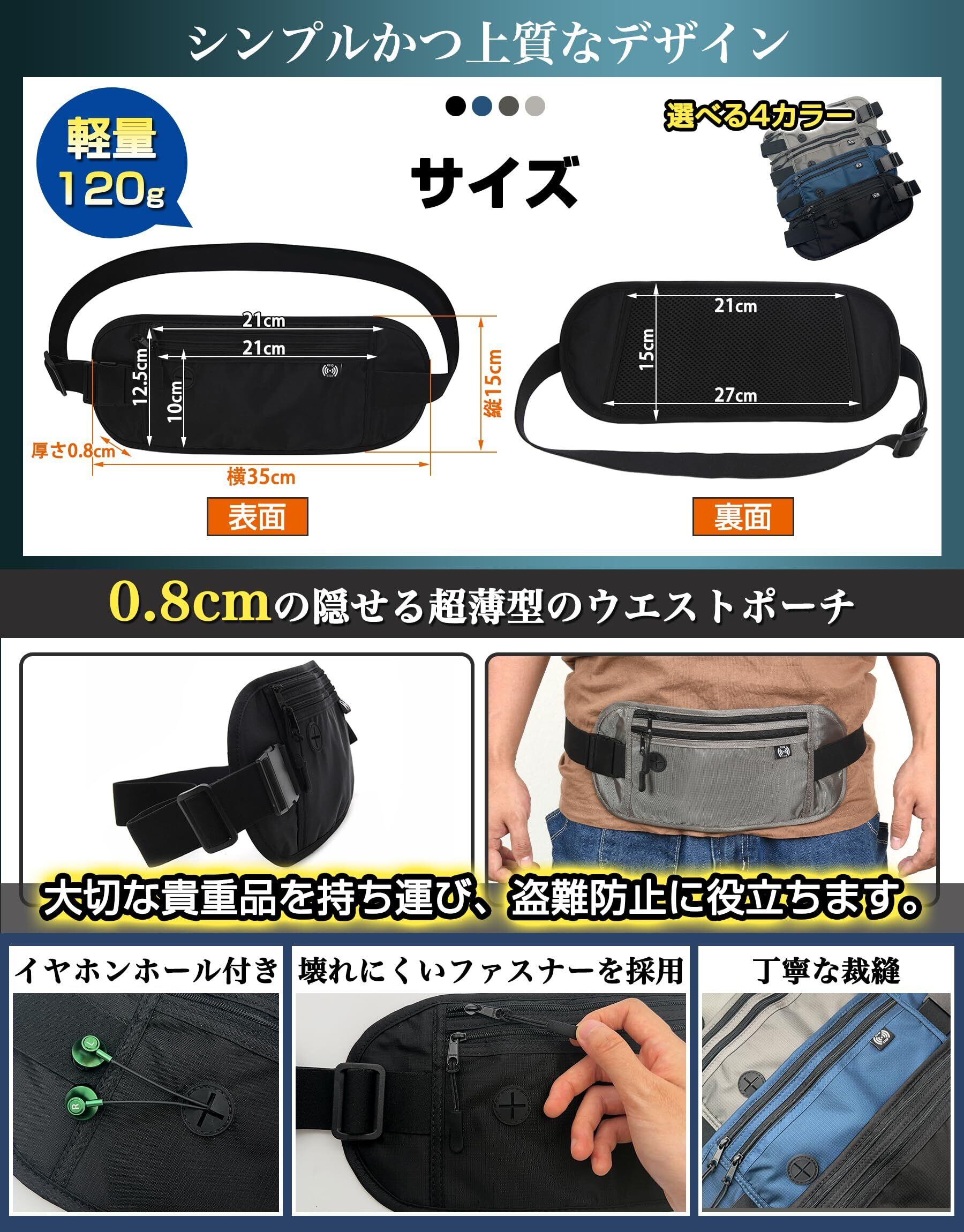 【隠せる超薄型のウエストポーチ】0.8cmの超薄型腹巻きタイプのウエストポーチなので服の下にもすっきりしまうことができ、大切な貴重品やお金を入れるシークレットな財布としても活用できます。着用時にもズレにくく、サイズ調整も自由にできる特徴があります。体にぴったりフィットするのでランニングポーチとしてもご利用いただけます。旅行、出張、ちょっとした外出、ウォーキング、公園、アウトドアなどの幅広いシーンで使えます。