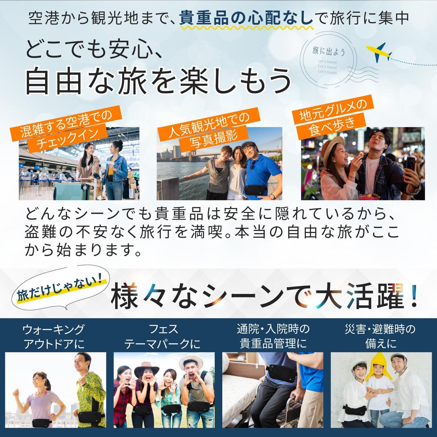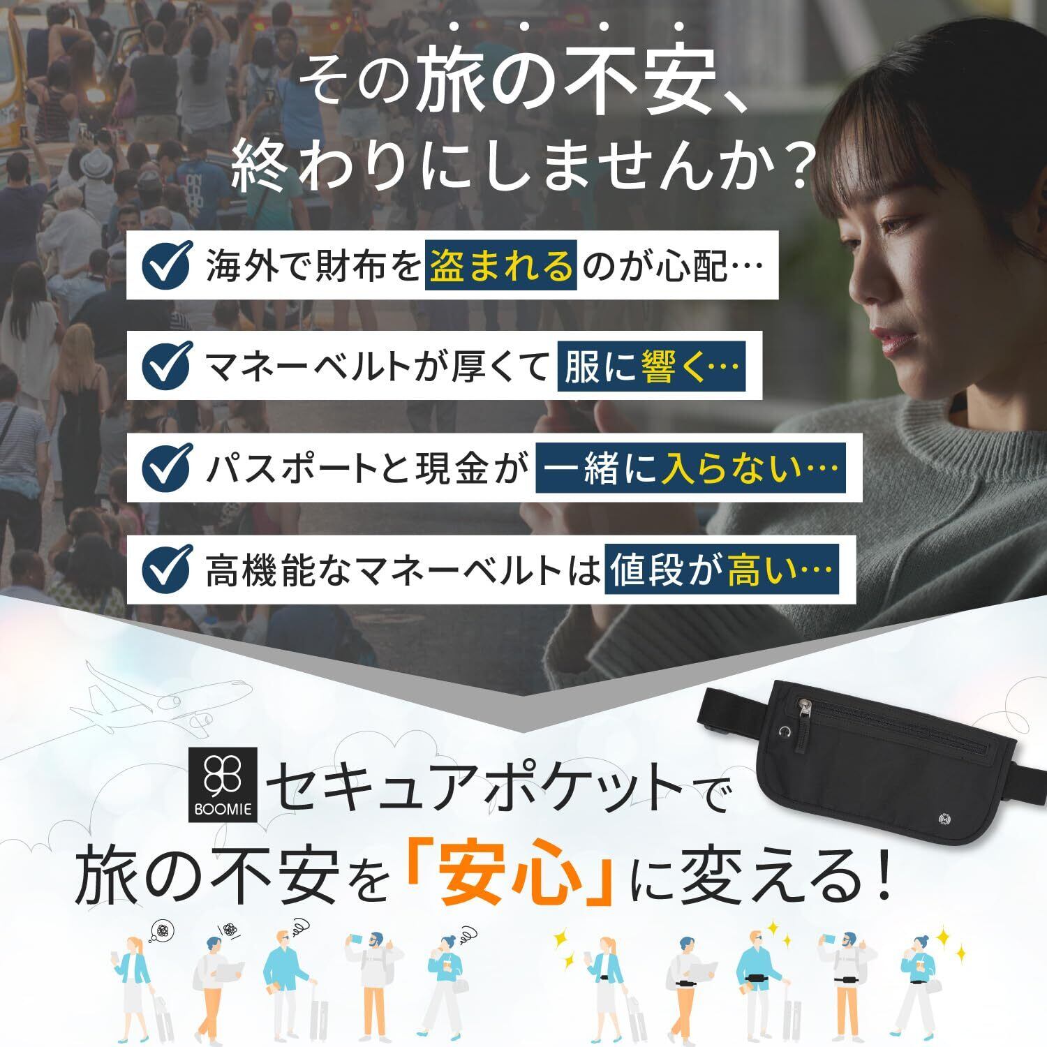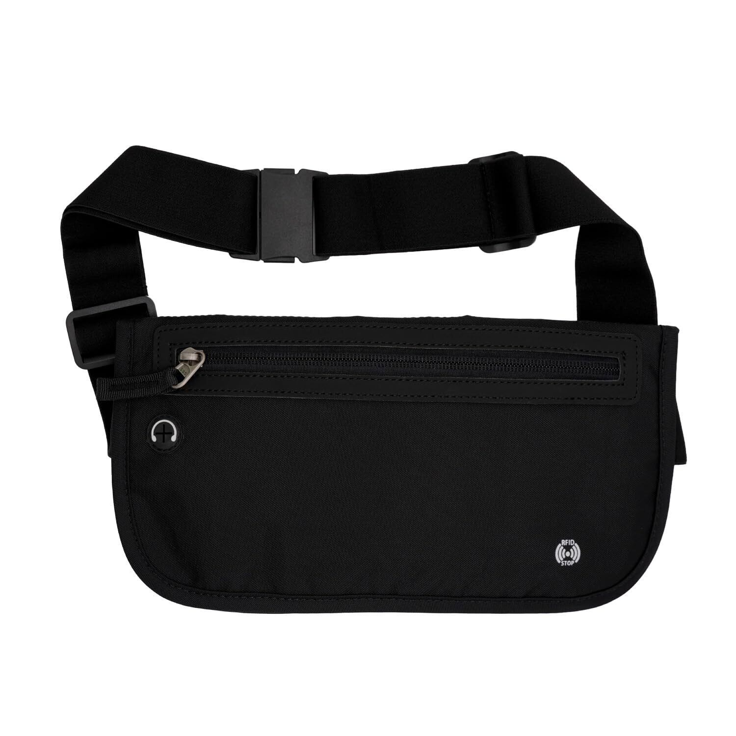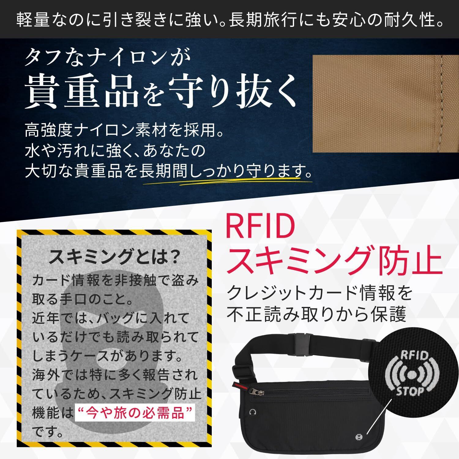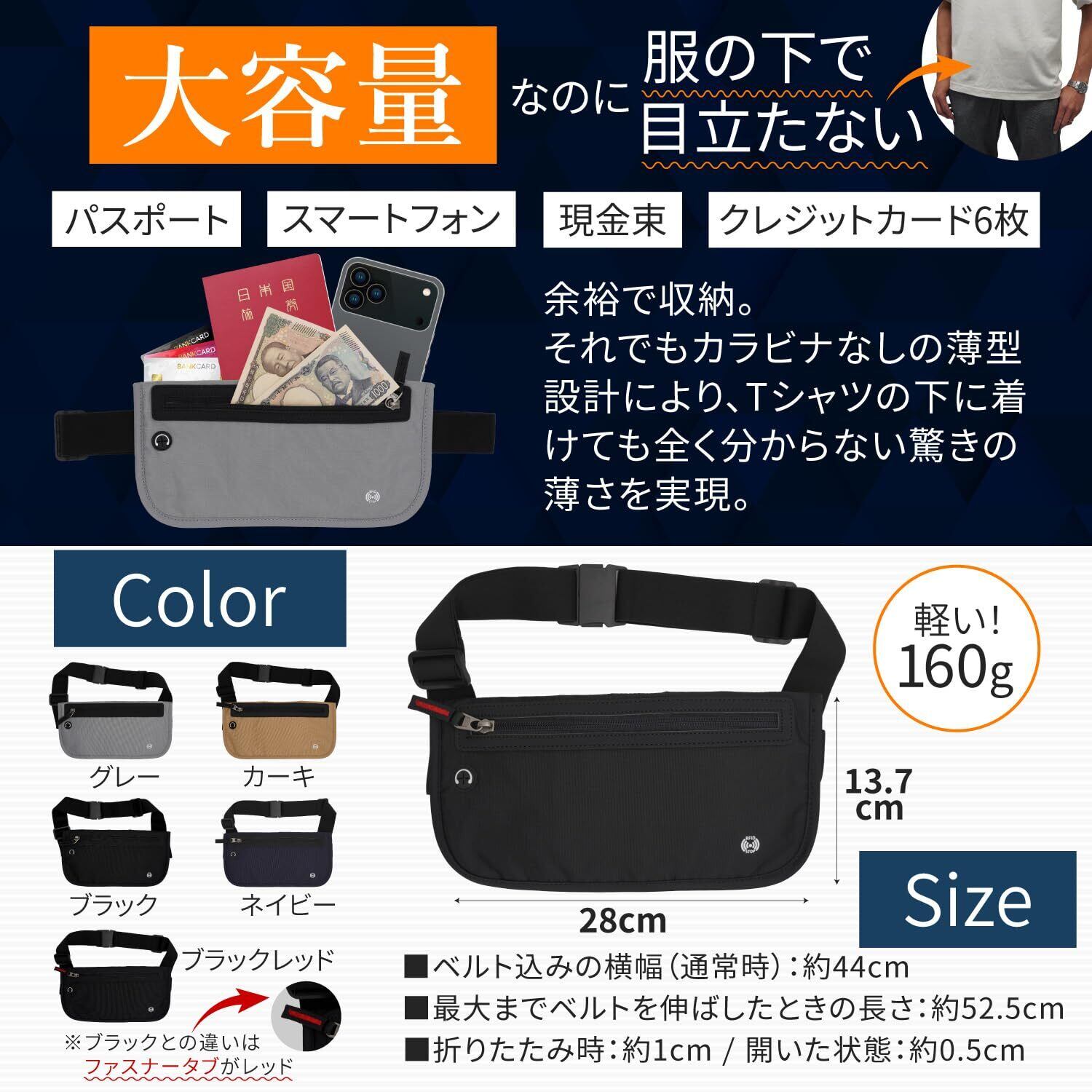 boomie セキュアポケット マネーベルト 薄型 海外旅行 セキュリティポーチ RFID スキミング防止 ウエストポーチ 貴重品入れ ウエストバッグ 大容量 (ブラック, M)