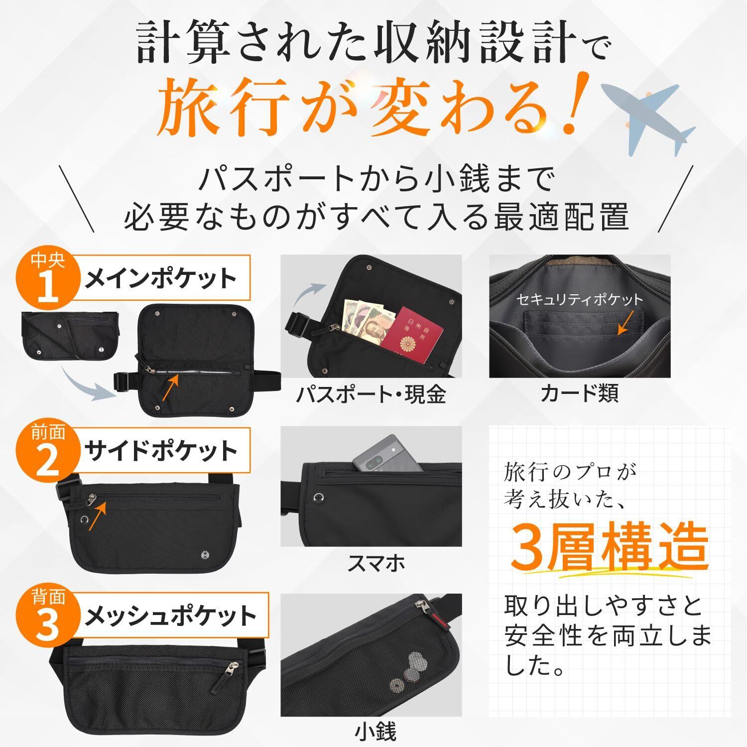 【大容量なのに究極薄型設計】パスポート、現金、クレジットカード5枚、スマートフォンまで余裕で収納できる大容量設計でありながら、カラビナを排除した究極の薄型ボディを実現。服の下に装着しても全く目立たず、完璧な隠匿性を保ちます。
