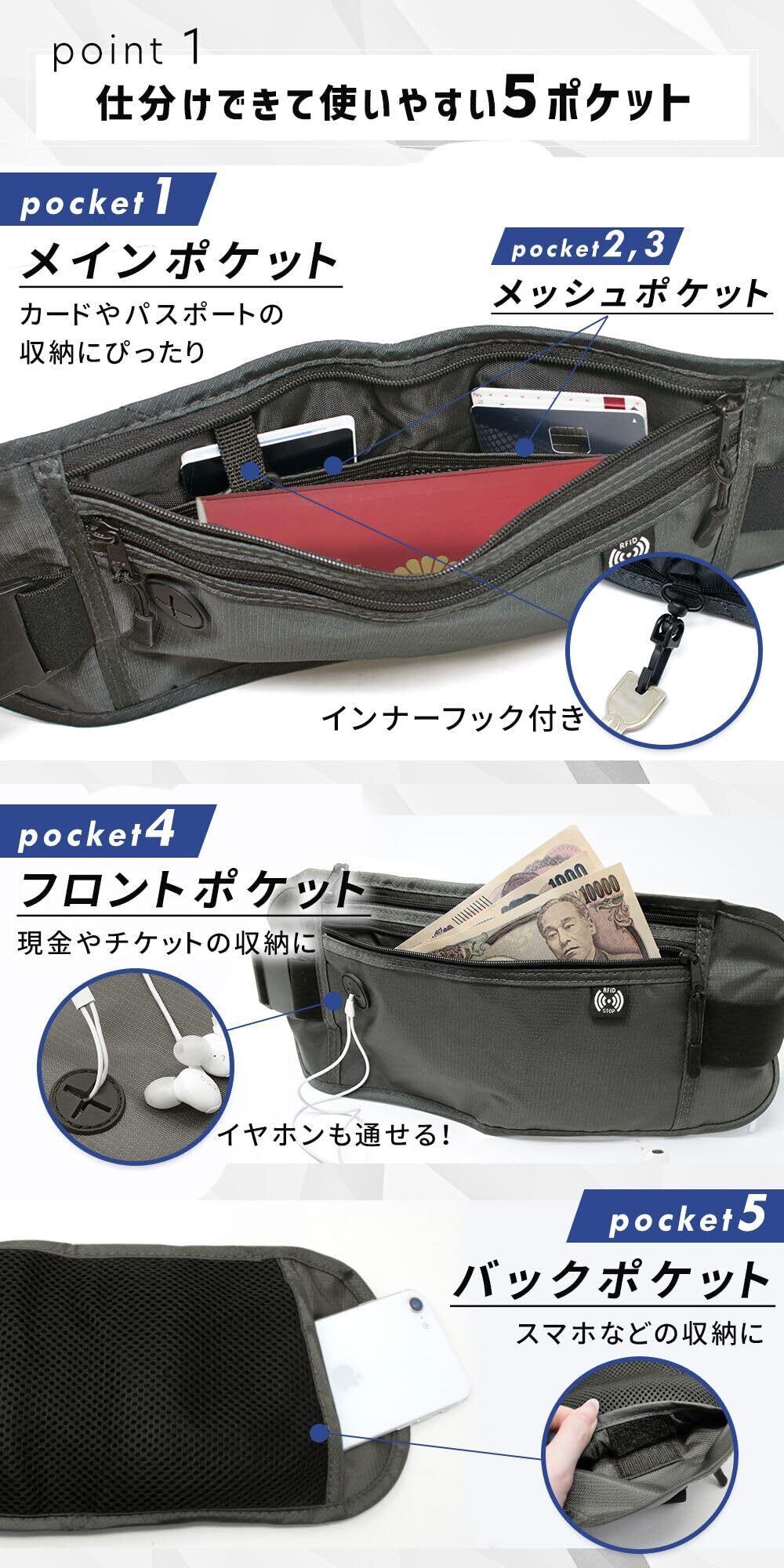 【収納力抜群&イヤホン穴付き】パスポートやスマートフォン、小銭、鍵などを分けて収納できる複数ポケット付き。イヤホン穴も搭載で移動中も便利。