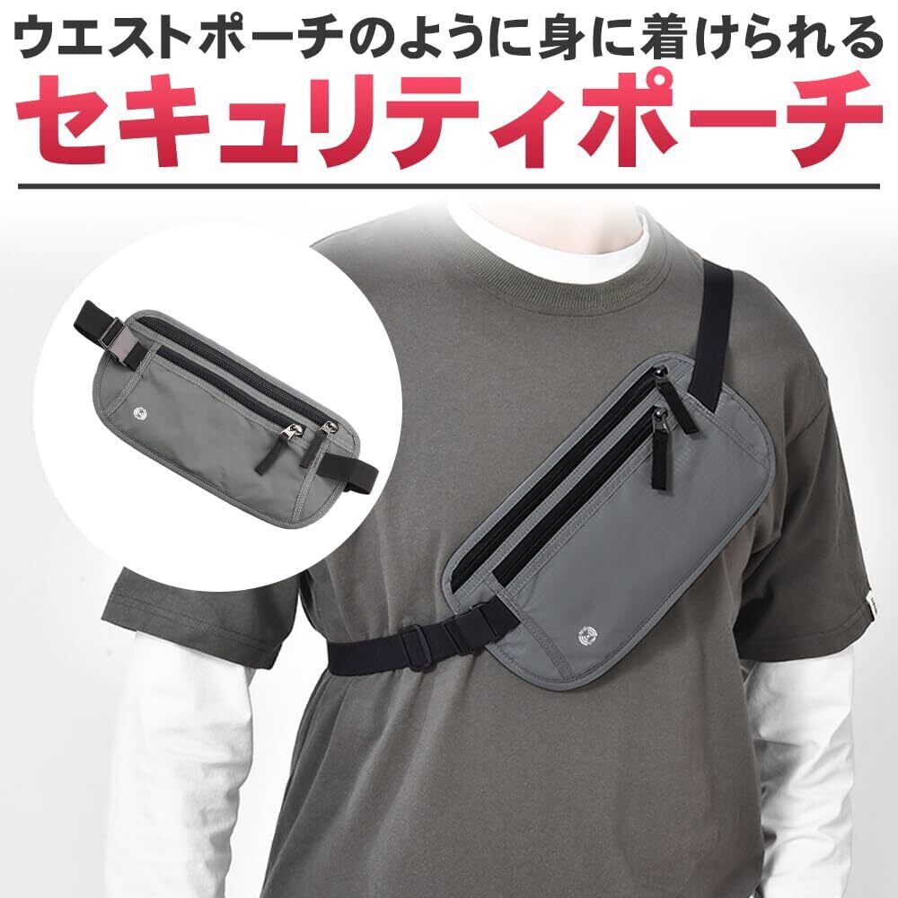 ウエストポーチのように身に着けるセキュリティポーチです。海外旅行や知らない町への旅行で活躍します。大切な貴重品やパスポートの管理にお勧め。急な雨でも慌てない撥水加工を施しています。