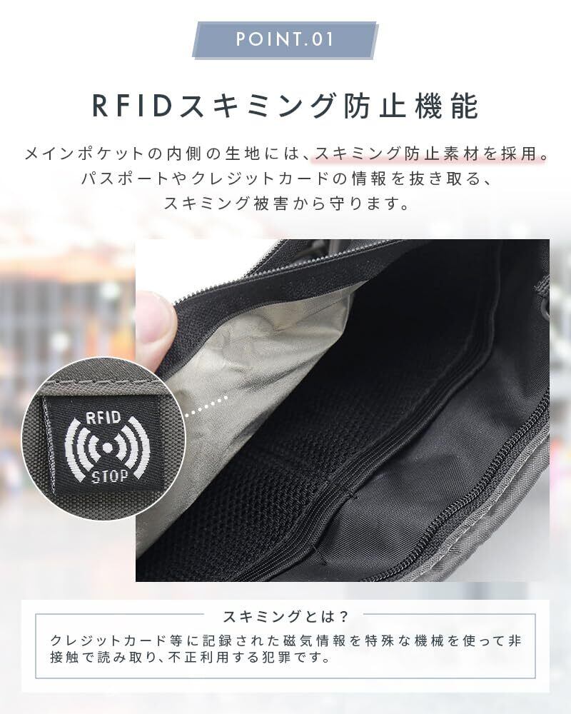 ●メインポケットの内側の生地には、スキミング防止素材を採用。パスポートやクレジットカードの情報を抜き取る、スキミング被害から守るRFIDスキミング防止機能。※「スキミング」とは、クレジットカード等に記録された磁気情報を、特殊な機械を使って非接触で読み取り、不正利用する犯罪です。