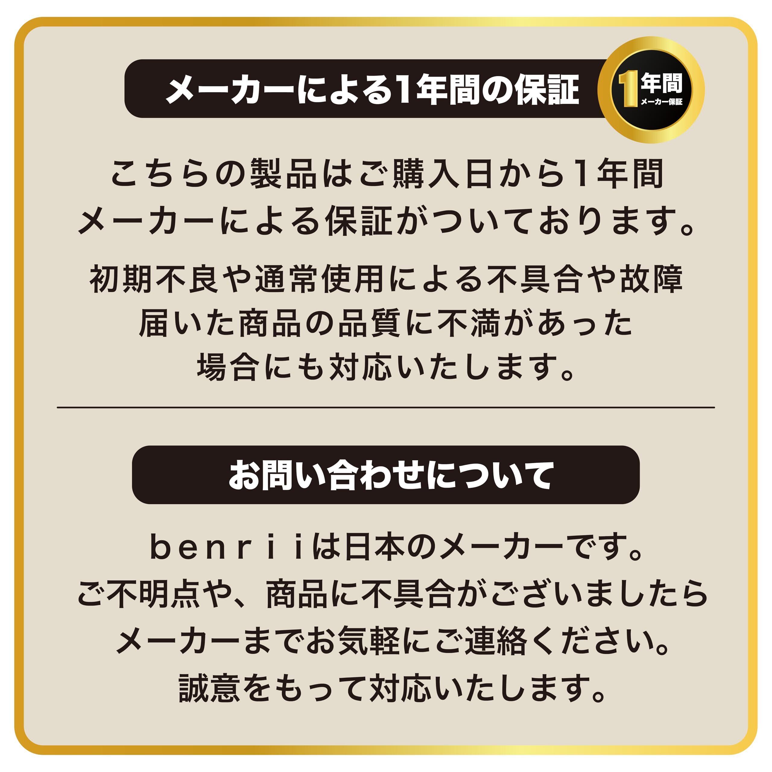 【安心の国内企業】benriiは安心安全の国内企業。1年間の保証付き! 商品は万全の状態で発送しておりますが、万が一、輸送中の破損や傷などがございましたら、誠意をもってご対応いたします。お手数ですが、ご連絡いただければ返金交換等の対応をさせていただきます。