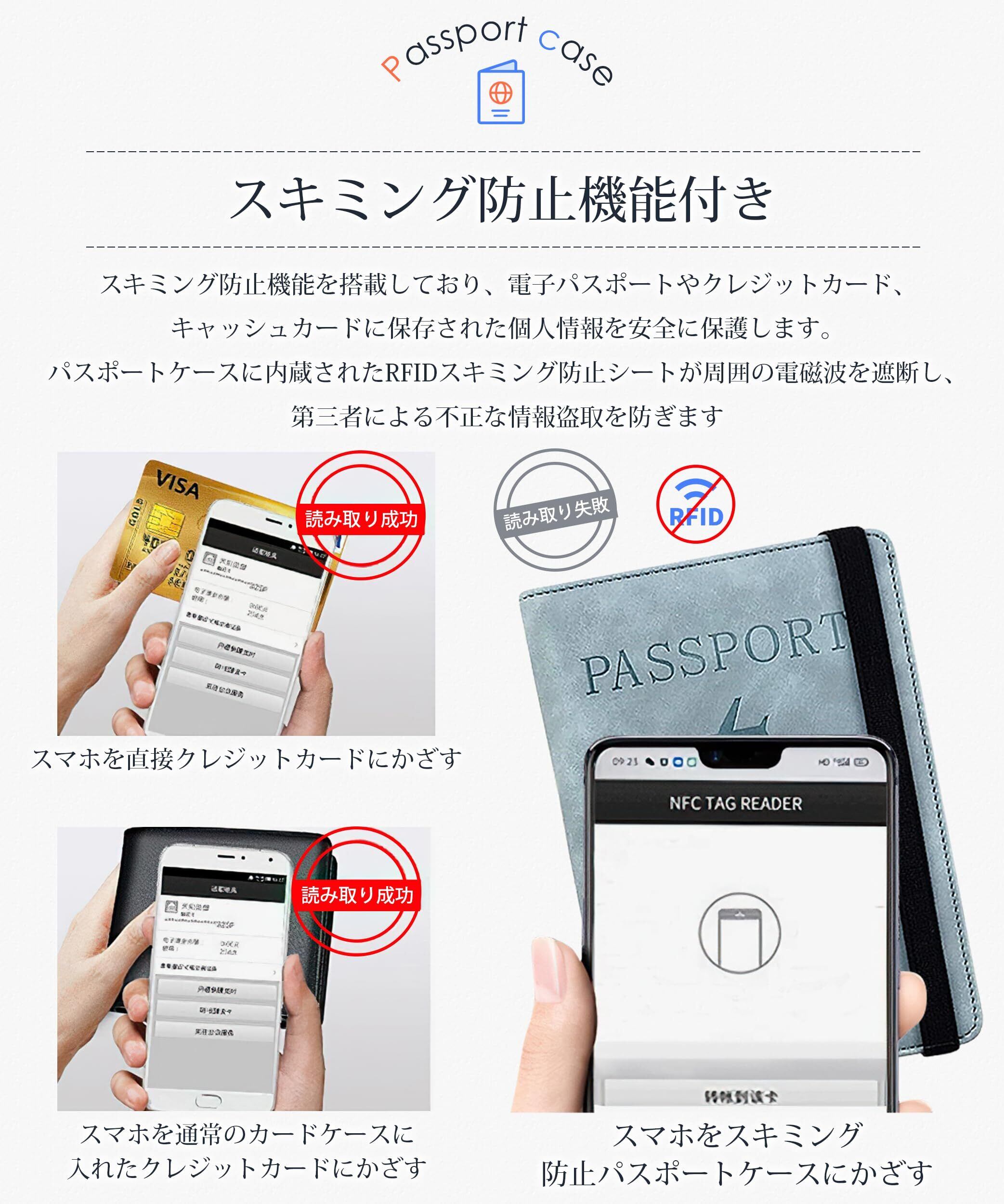 【スキミング防止機能付き】 パスポートケースは、スキミング防止機能を搭載しており、電子パスポートやクレジットカード、キャッシュカードに保存された個人情報を安全に保護します。パスポートケースに内蔵されたRFIDスキミング防止シートが周囲の電磁波を遮断し、第三者による不正な情報盗取を防ぎます。パスポートケースは人混みや海外旅行中などで、個人情報の漏洩や窃盗を防ぐために重要なセキュリティ対策となります。