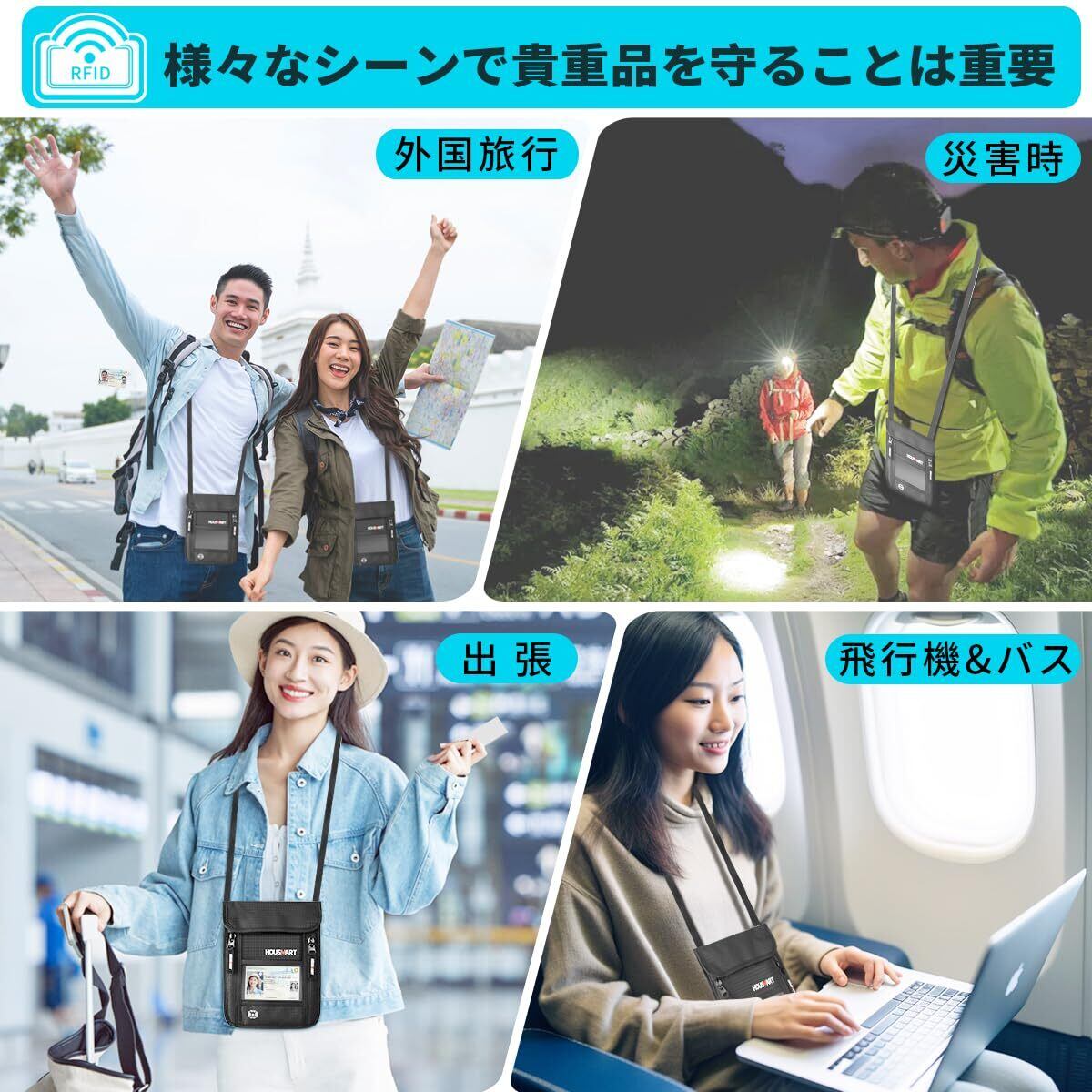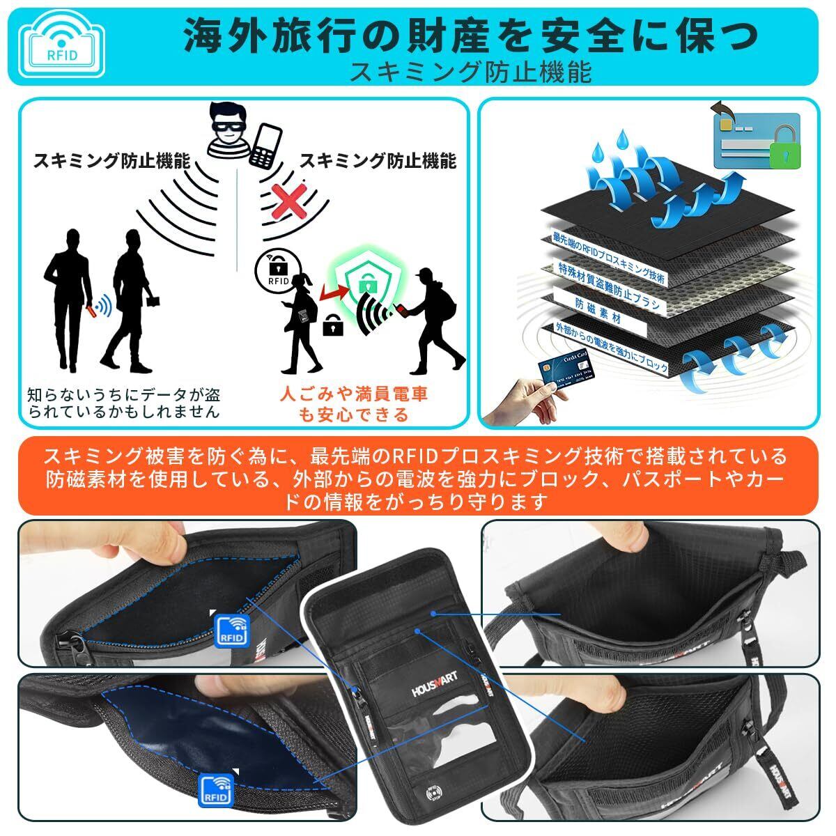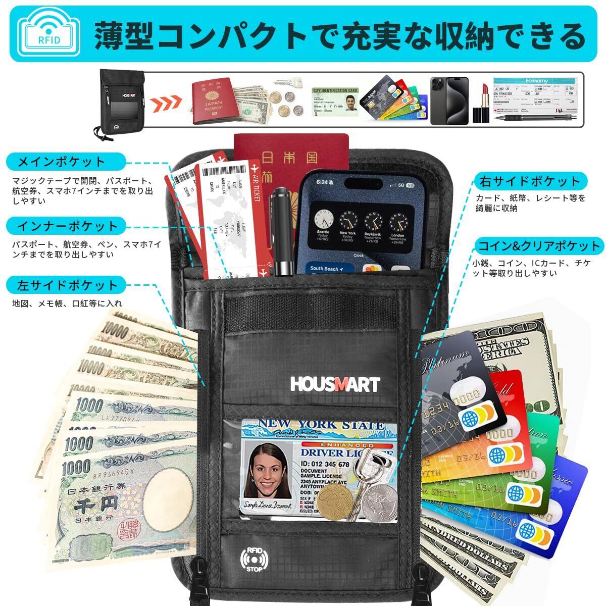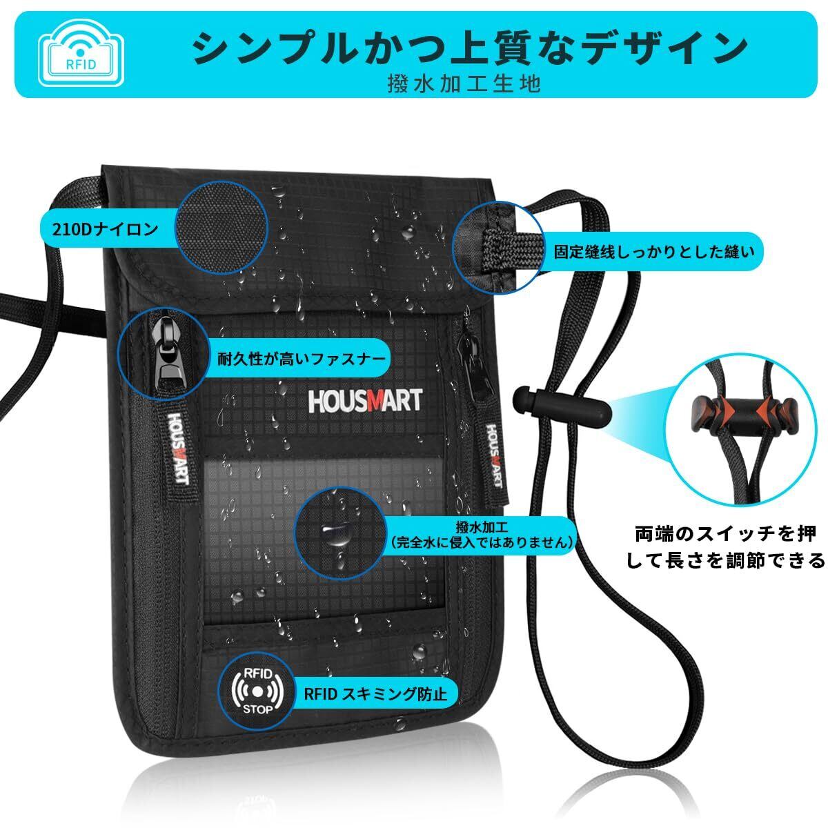 [HOUSMART] パスポートケース 首下げ スキミング防止 パスポートカバー セキュリティポーチ 海外旅行 貴重品防犯 便利グッズ 財布 軽量 薄型 服の中に隠せる 撥水 ブラック ナイロン