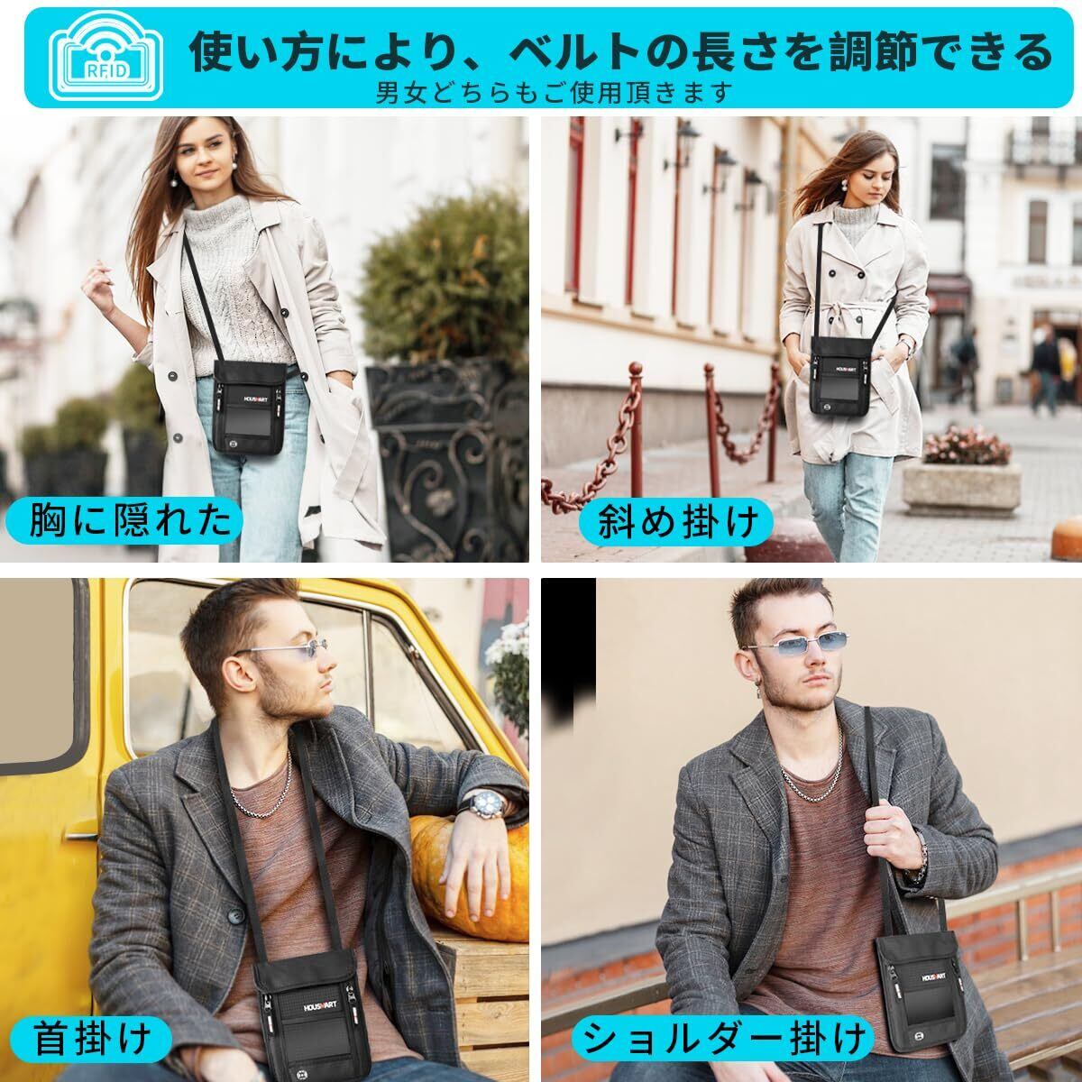 【服に隠せる薄型・超軽量】薄さ1.2cmの薄型タイプなので服の下に装着しても目立たず、 遺失、スリ、置き引きなど防げます。パスポート ケース63gでとても軽いので長時間で首に掛けて疲れません、長さ調節も可能で、首掛け、肩、斜め掛けの装着が可能です、男女兼用で身長目安140~190cmまで対応できます。