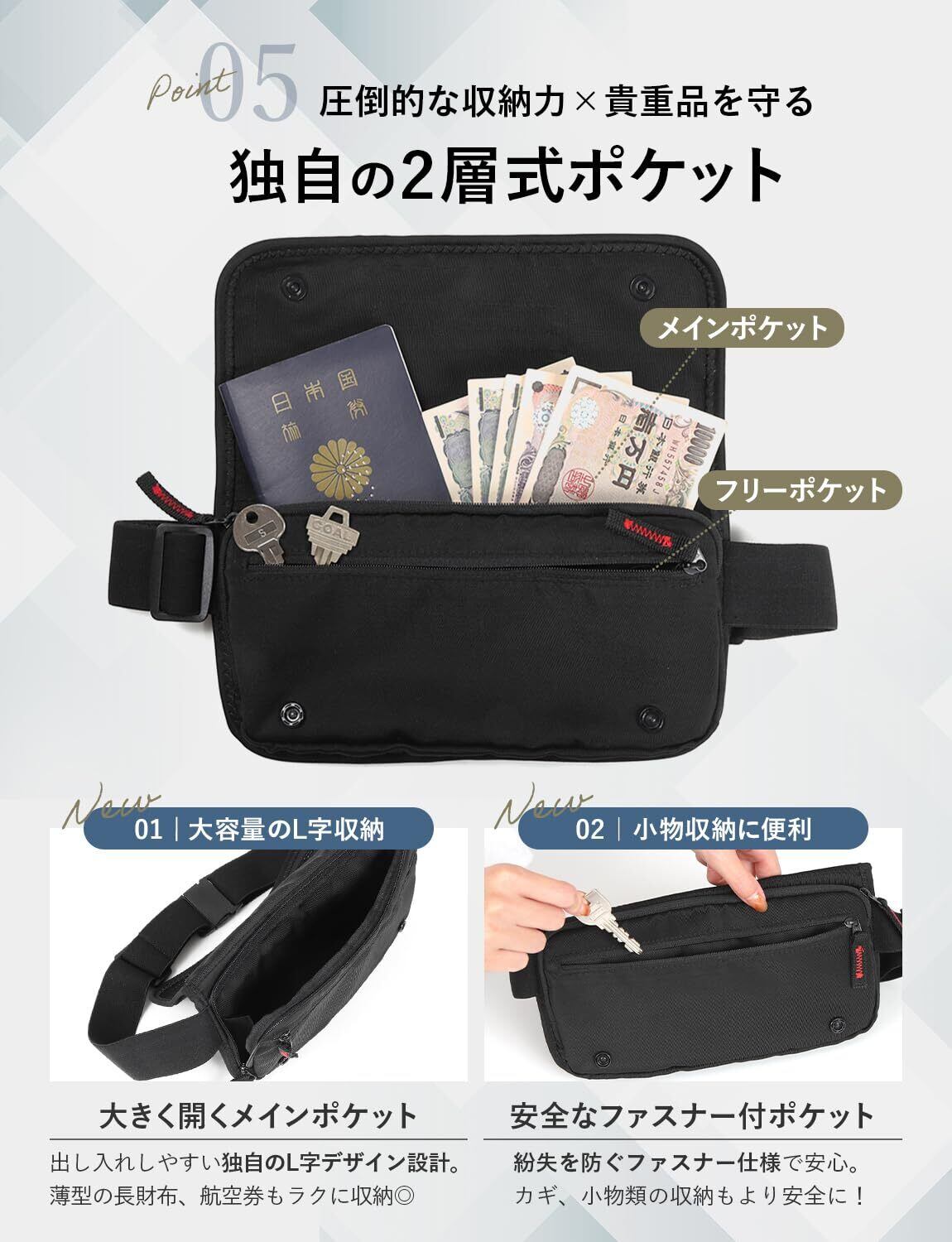 【 2層構造収納 × 凝縮された機能性 】 シンプルだからこそ機能性は厳選し、凝縮しました。VIVALD セキュリティポーチ は、同じに見えても造りは他とは違う。パスポートケースを保管できる2層式の内ポケット、鍵を安全に収納すファスナーポケットを完備、着用後のフィット感を高める調整機能付き、腰回りにやさしい伸縮ゴムベルト、スムーズな日本社YKKファスナー仕様など他にもたくさん。現地でも身軽で安心安全な旅行をサポートします。
