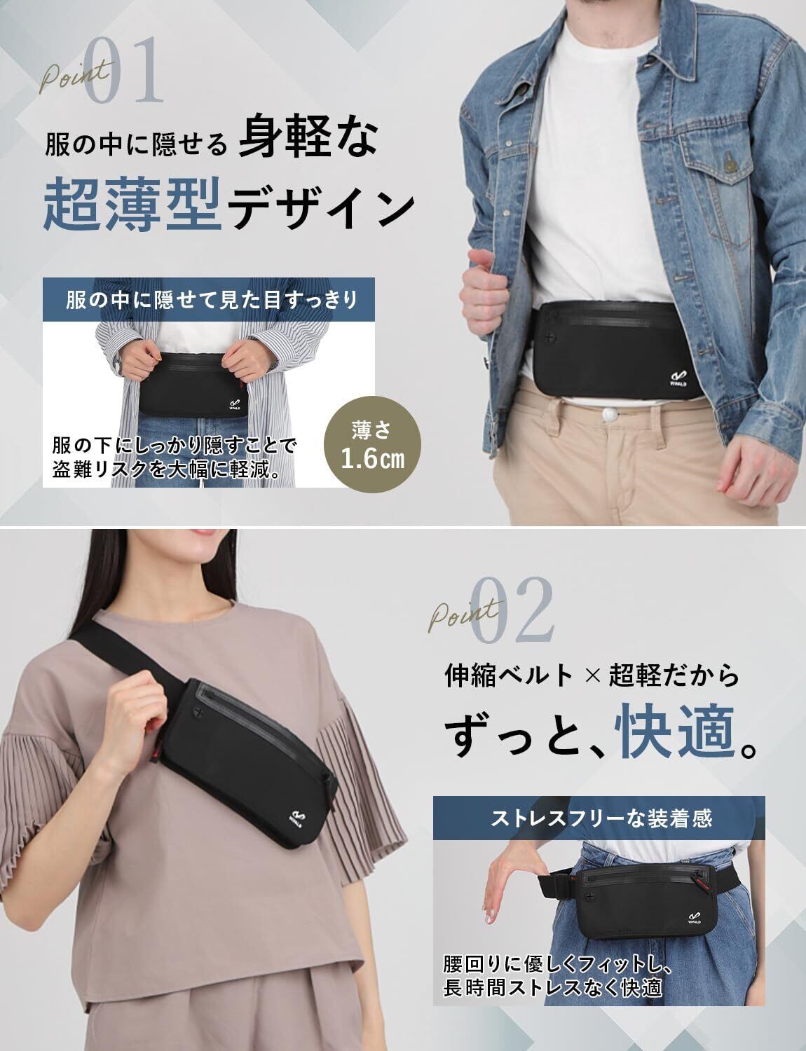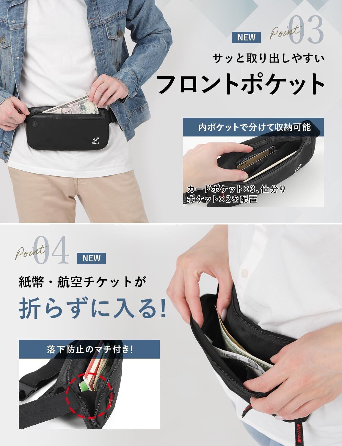 【 服の下に隠せて安全快適 】薄さわずか1.6㎝。服の中にスッと隠せ、外からの着用が分からない超薄モデル。 旅先で欠かせない パスポート、パスポートのコピー、クレジットカード、予備の現金、緊急時の連絡先、自宅の鍵など必須アイテムをすべて収納できる 嬉しい大容量設計。旅先の使いやすさはもちろん、撥水効果で急な雨も安心。 VIVALD セキュリティポーチで 海外旅行を安心安全でもっと、快適に。