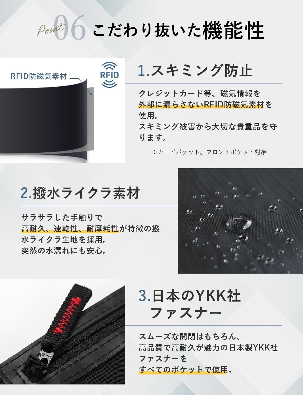 【 スキミング防止機能で安心 】大切なパスポートや カード情報を守る スキミング防止機能を搭載。カード決済が年々増えていく反面、不正利用が深刻な社会問題となっています。 海外旅行 をする際、スキミング防止機能付き が必須です。VIVALD セキュリティポーチ (トラポ)は、スキミング防止機能に加え、すべてのポケットがファスナー付きで安心。ダブルの防犯対策であなたを守ります。