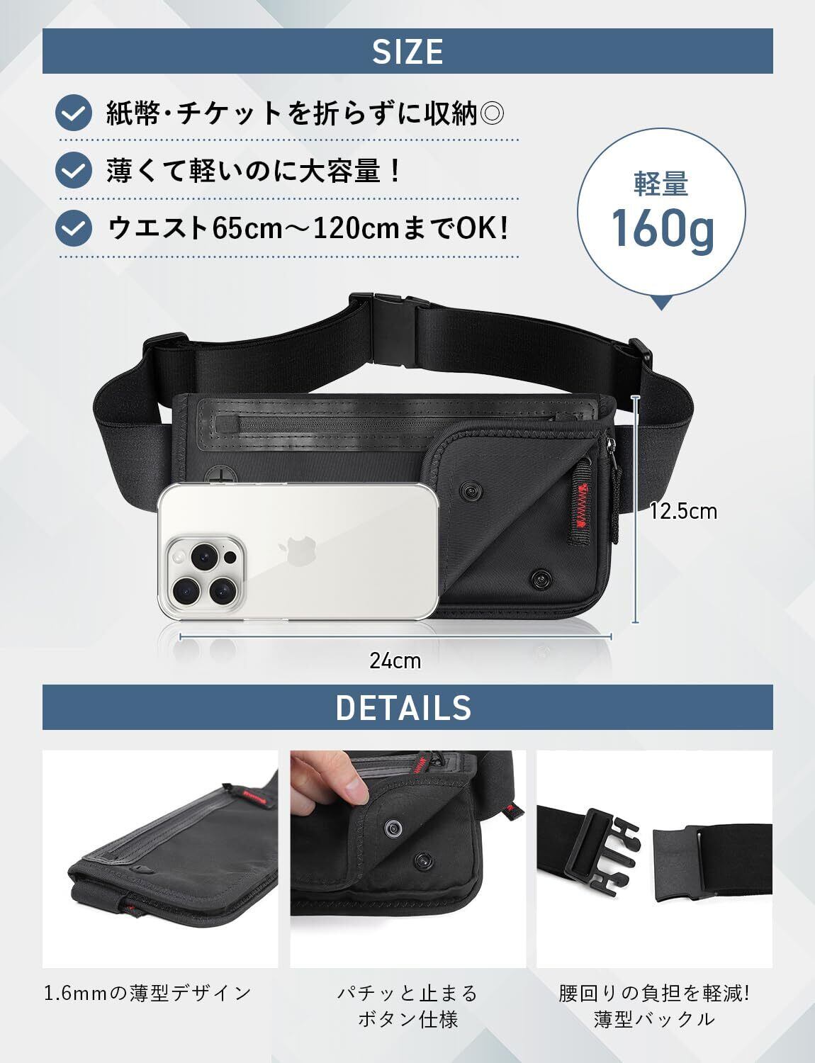 【 腰回りが痛くない。快適なフィット感 】長時間の着用を考えて腰に負担が少ない「伸縮性ウエストゴム」を採用しています。着用時にもズレにくく、“お腹周りが苦しくならない” のが特徴。肌触りもやさしく着用を忘れるくらいで、着用後も 一日中ずっと、ノンストレス。 また、ベルト調整も自在でラクラク。ウエストポーチとしてはもちろん、斜めがけ(胸の高さ程度)のショルダーバッグ としての使用可能。服装・シーンに合わせたスタイルでご使用ください。