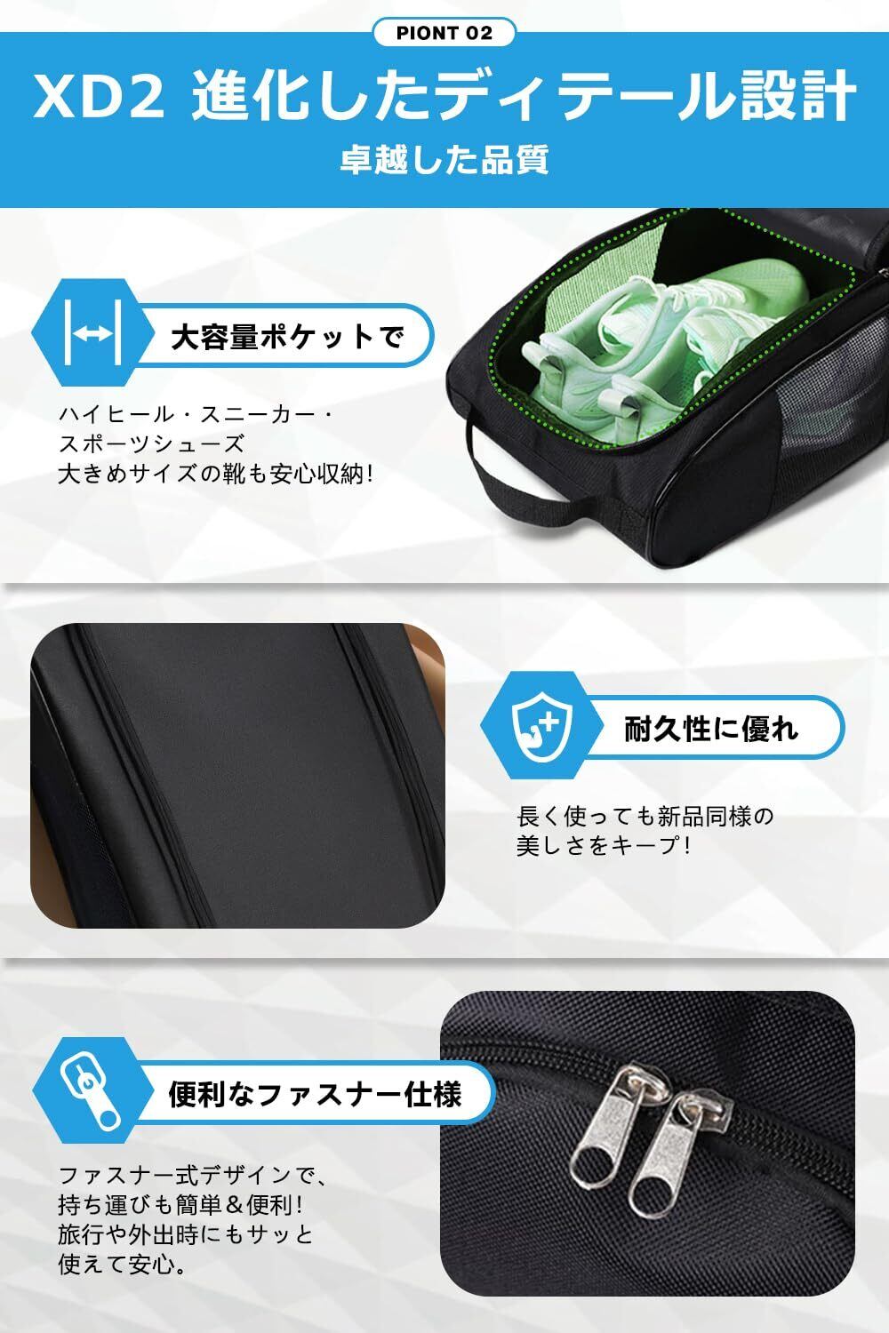【XD2|大きめジッパータブ&ダブルファスナー搭載】 スムーズな開閉を実現する大きめのジッパータブとダブルファスナーを採用。XD2はシューズの出し入れが簡単で、忙しい日常やスポーツ後でも使いやすさ抜群。機能性を重視した設計で、使うたびに便利さを実感できます。