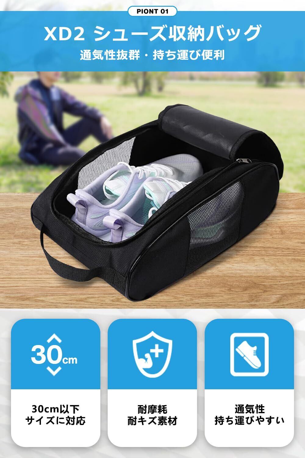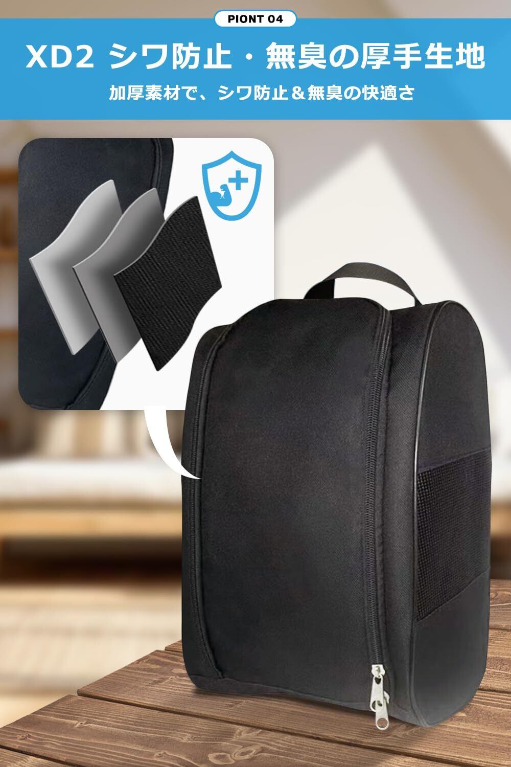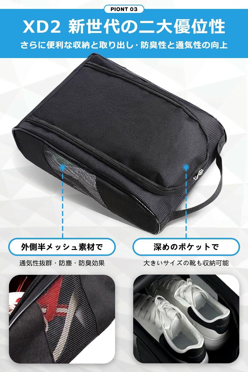 【XD2|通気性抜群で蒸れないメッシュ構造】 メッシュ通気口を採用したXD2は、シューズ収納時でもムレを防ぎ、空気がしっかりと循環するため、使用後の靴でも湿気やニオイがこもらず、清潔な状態をキープできます。スポーツ後や長時間の使用でも快適に持ち運べるのが特長です。