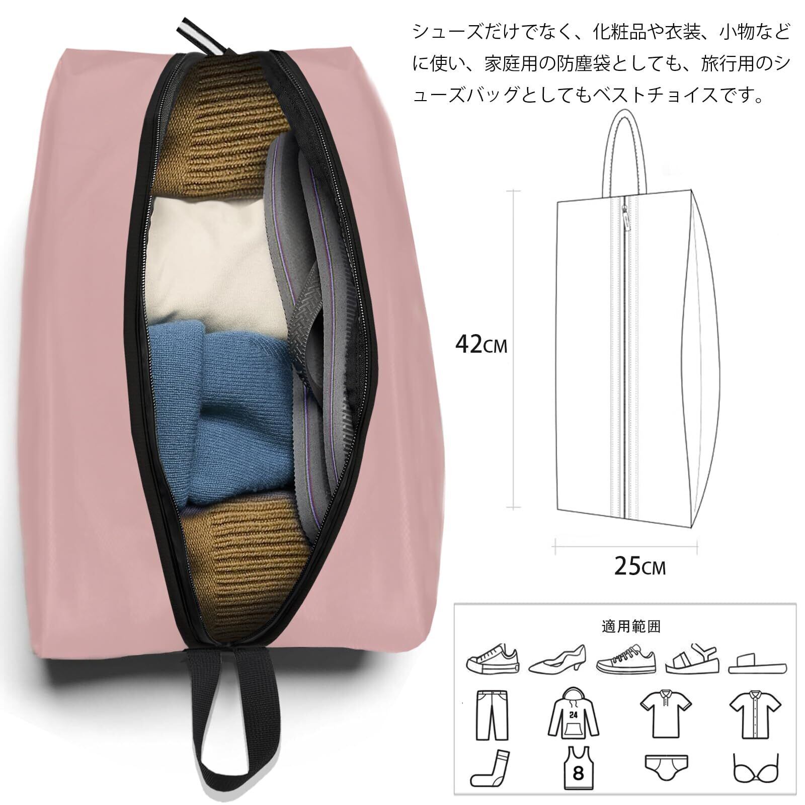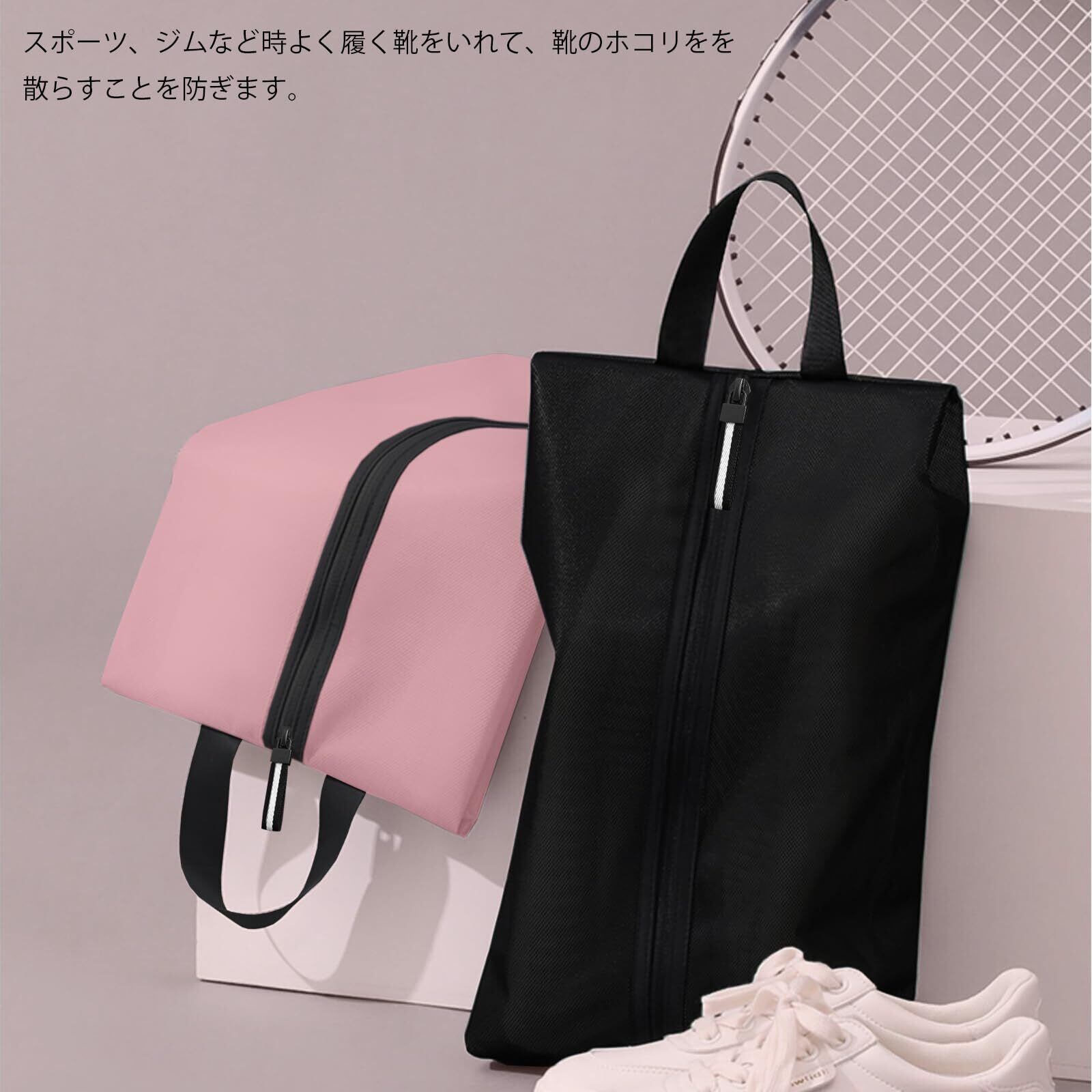 【防水防汚】シューズバッグの本体はポリエステルで作られており、汚れに強く、防水機能も優れております。防水防汚で、水洗い可能です。いつでも清潔にお使いいただけます。