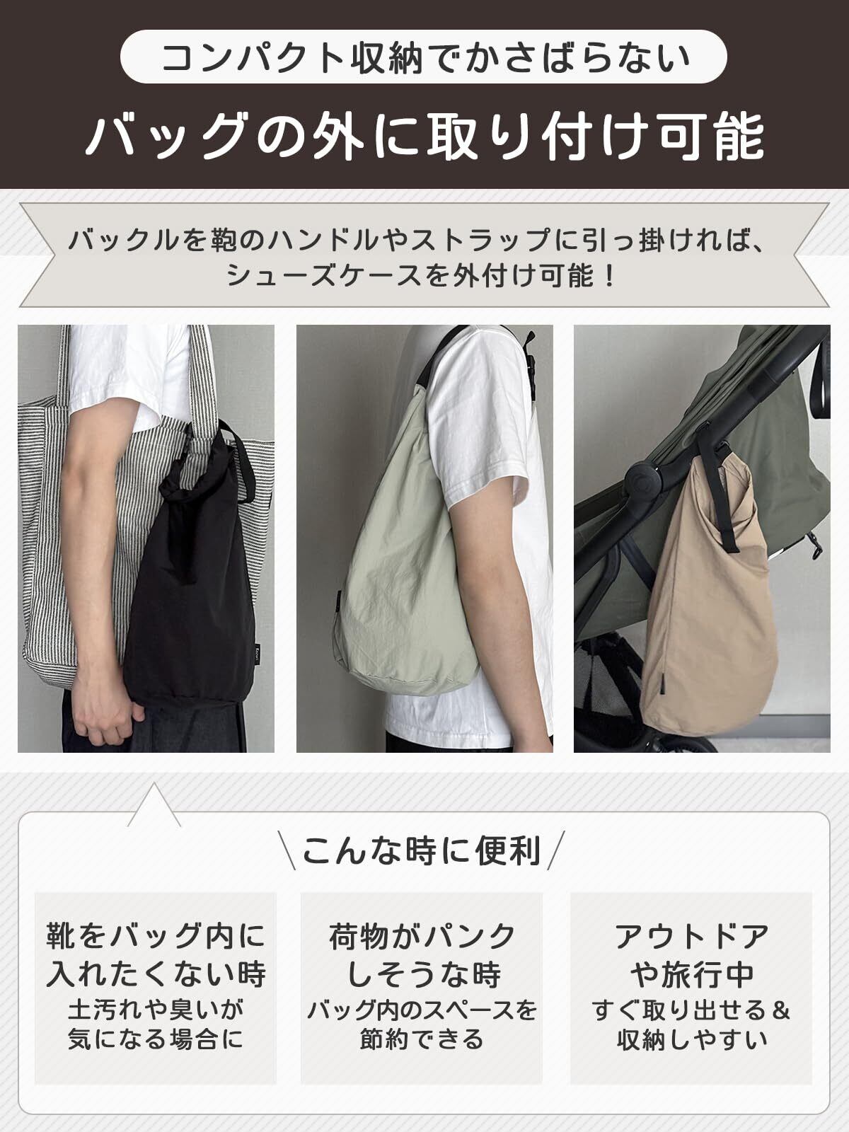 【バッグに取り付け可能な便利なデザイン】YKK製高品質バックル採用で耐久性◎バックルをカバンやリュックのハンドルに掛けて外付け可能。荷物が多い時や靴を別で持ち歩きたい時に便利です。【旅行・ジム・日常使いまで大活躍】靴の持ち運びが必要なあらゆるシーンで便利。収納ケースとして小物入れにも使え、小学生から大人までユニセックスで利用可能です。
