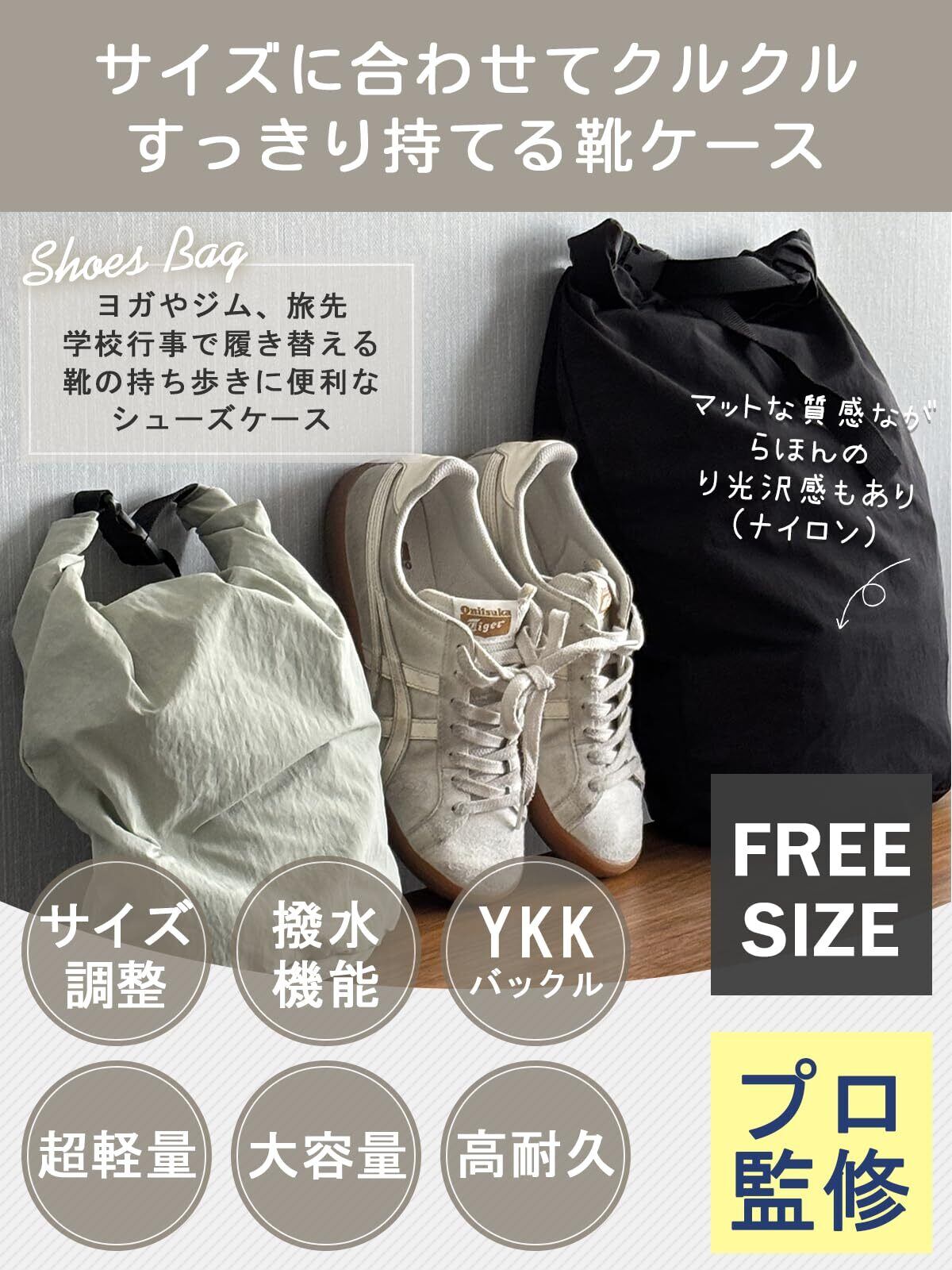 シューズバッグ シューズケース 【サイズ調整・YKKバックル・5色/2サイズ展開】 コンパクト収納袋 シューズ袋 上履き袋 靴入れ 靴袋 上靴入れ 上履き入れ 撥水加工 携帯便利 超軽量 小学生 高学年 男の子 女の子 大人 子供 旅行 ジム 授業参観 ユニセックス (黒, L)