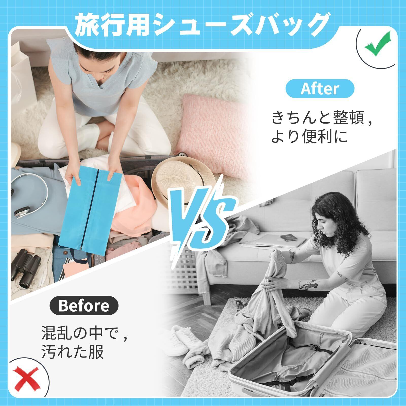 多用途&多機能 - シューズバッグとしてだけでなく、旅行用のランドリーバッグやトイレタリーバッグとしてもお使いいただけます。アイテムをカテゴリー別に収納できます。シューズバッグに何か問題がございましたら、お気軽にお問い合わせください。すぐにご返答いたします。