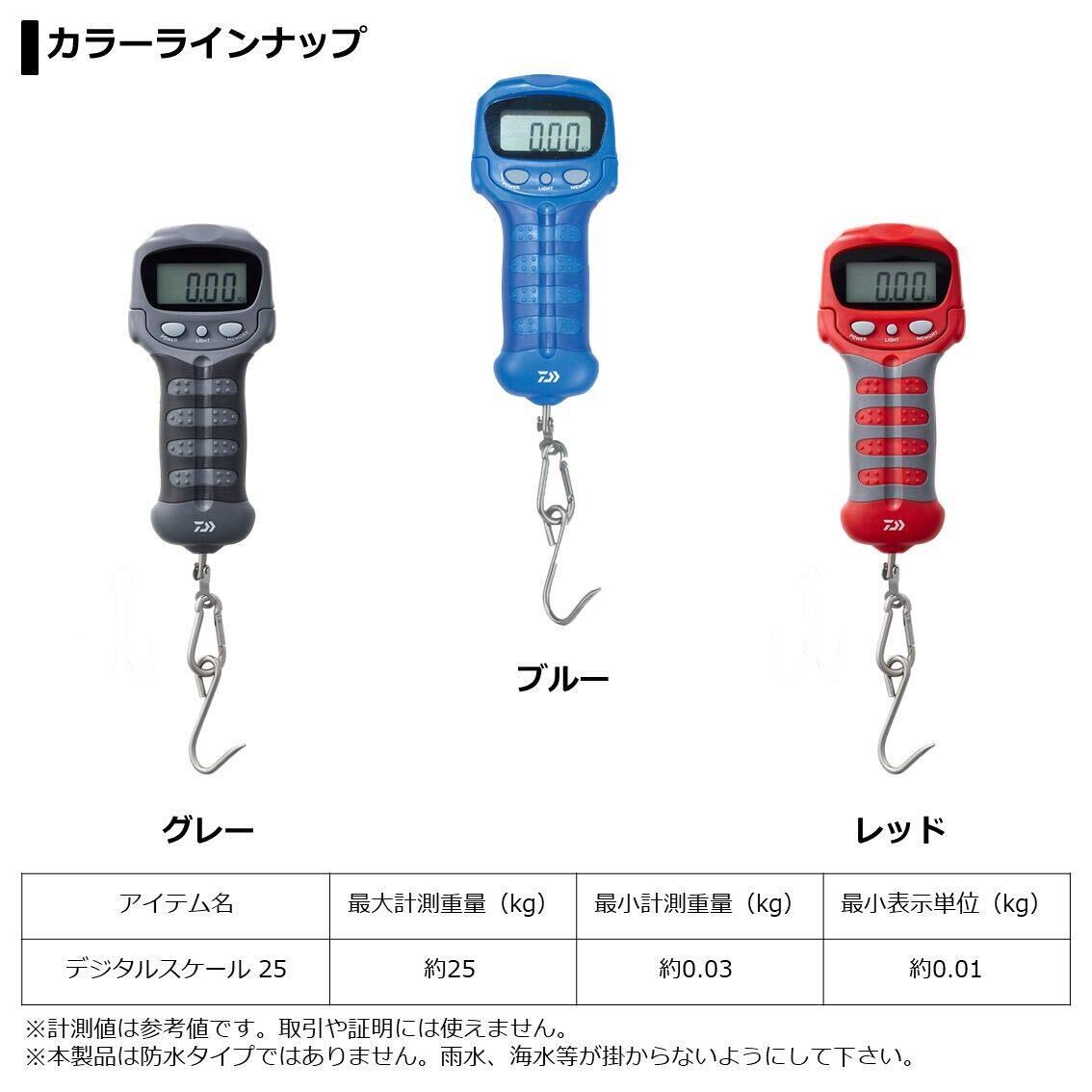 DAIWA/ダイワデジタルスケール25■寸法:(約):幅:70/高さ166/奥行き33mm■質量(約):105g(電池・カラビナ・フックは除く)■電池寿命:ライト点灯時/約90時間、ライト消灯時/約200時間■使用電池:単4形アルカリ乾電池2本(別売り)■計測重量:最小表示単位/約0.01kg、最小計測可能重量/約0.03kg、最大計測可能重量/約25kg●データーを10個までメモリー可能●滑りにくいラバーグリップ仕様●暗闇でも計測可能なライト付●両面が見やすい可動式ヘッド●カラビナ付なので簡単フック交換。(魚はもちろん、イカも測定できる交換フック付き)