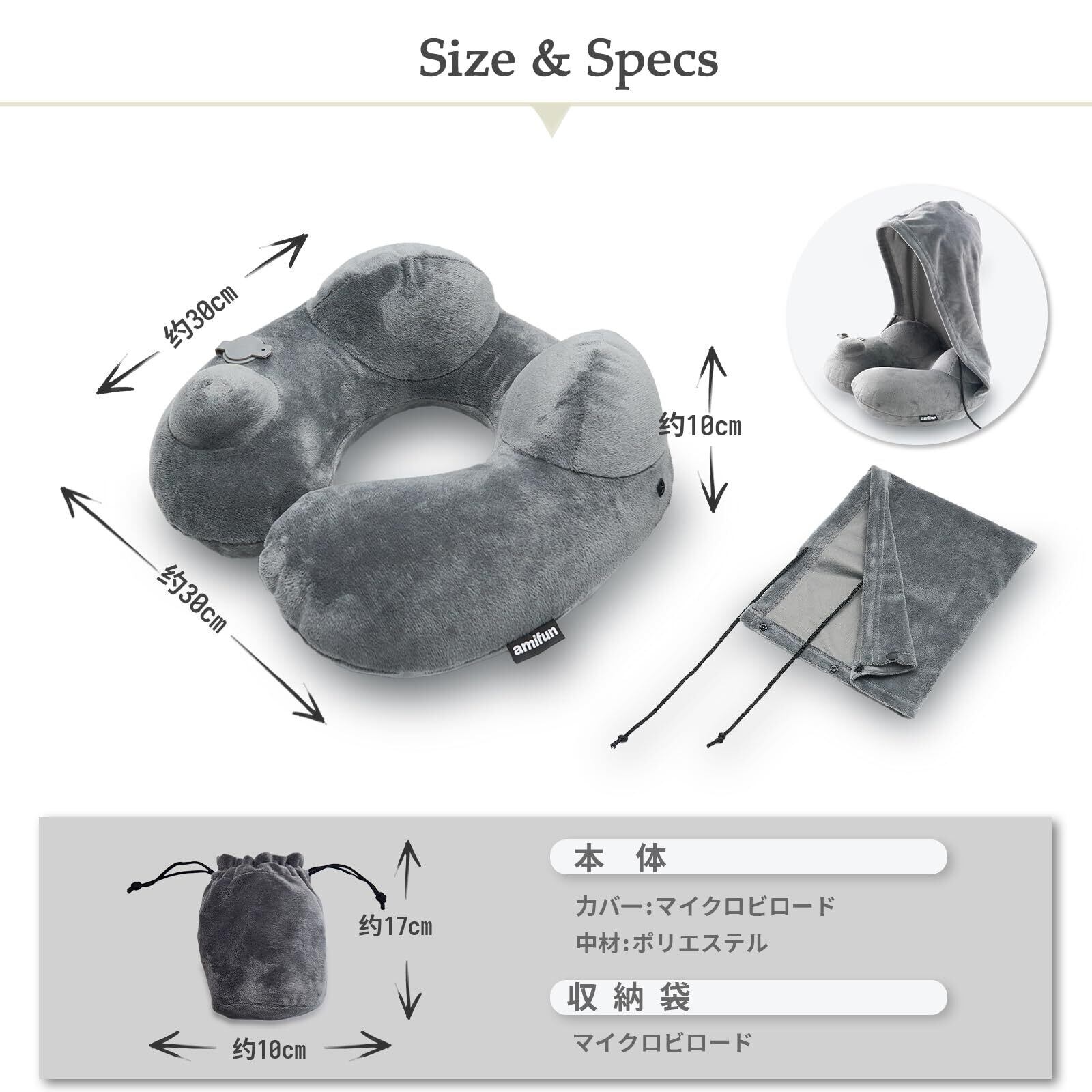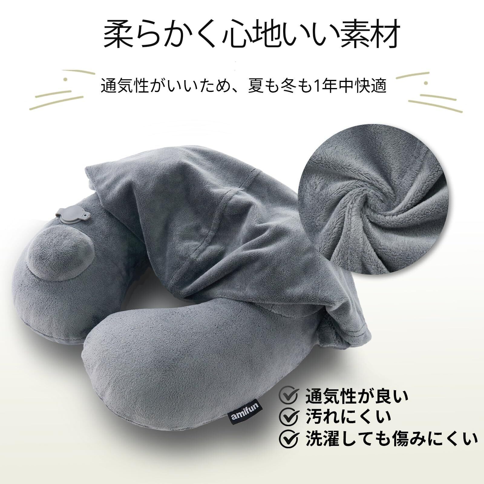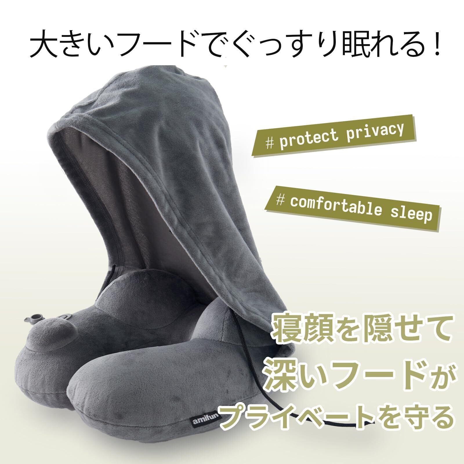 amifun ネックピロー 飛行機 車用 低反発 首枕 フード フード付き 旅行 便利グッズ 旅行グッズ トラベルグッズ 車 トラベル 携帯枕 車用品 便利グッズ グッズ 快眠 仮眠 枕 肩こり トラベルピロー 洗える 人気 プレゼント グレー