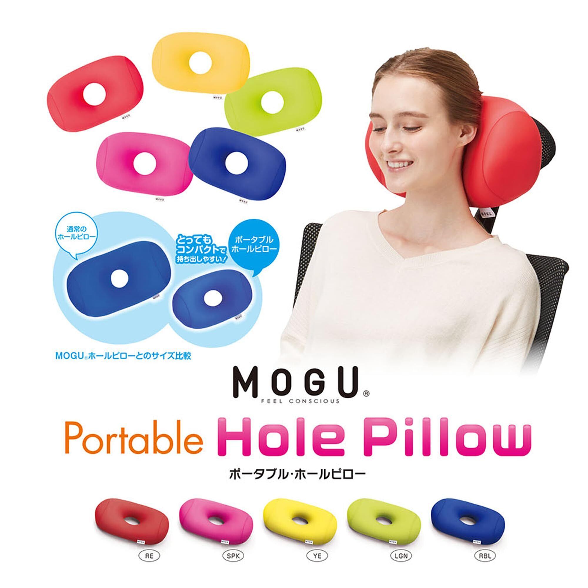 必要なところをやさしく支える;穴をあけることで、まくらに緩やかなカーブが生まれ、体の凹凸にぴったりフィット。MOGU独自の超微粒子ビーズが頭や腰、背中を心地よく支えます。