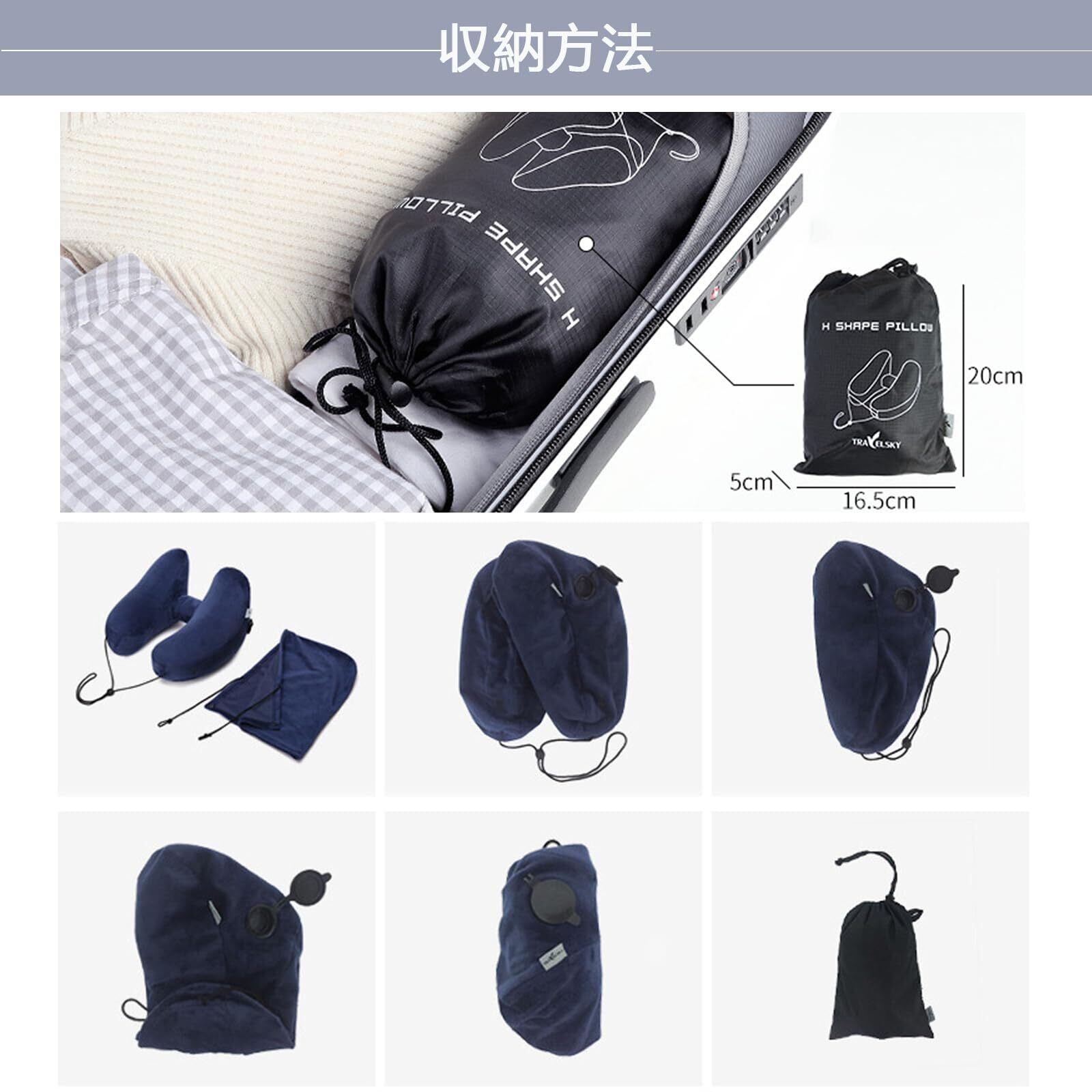 【H型デザイン&簡単に膨張と収縮!】H型ネックピローは新しい人間工学的デザインにより細部まで考えられ設計されています。座席や体勢に合わせてお好みの装着方法をお試しください。特に頭が前に下がってしまう方にはH型ネックピローが最適です。大口径の空気孔で3~5息を吹き込めば、簡単あっという間にパンパン!空気の注入量で枕の硬さを調節出来ます。空気を抜くときも逆止弁を指で押すだけ。すぐにぺったんこ!!