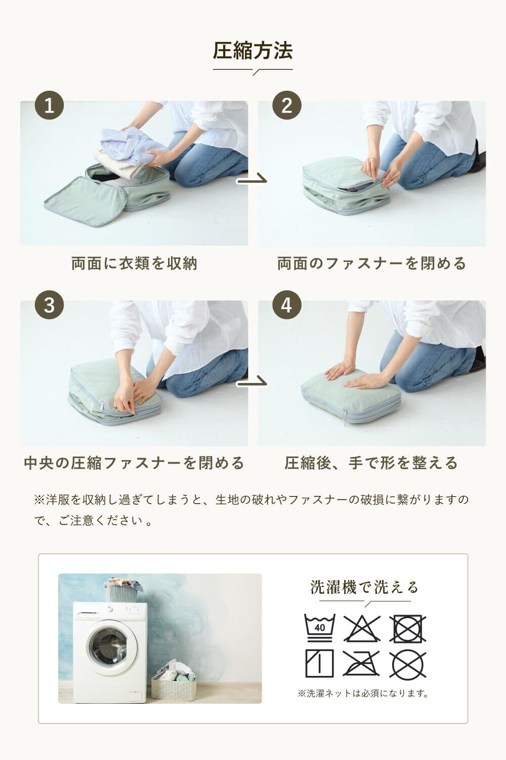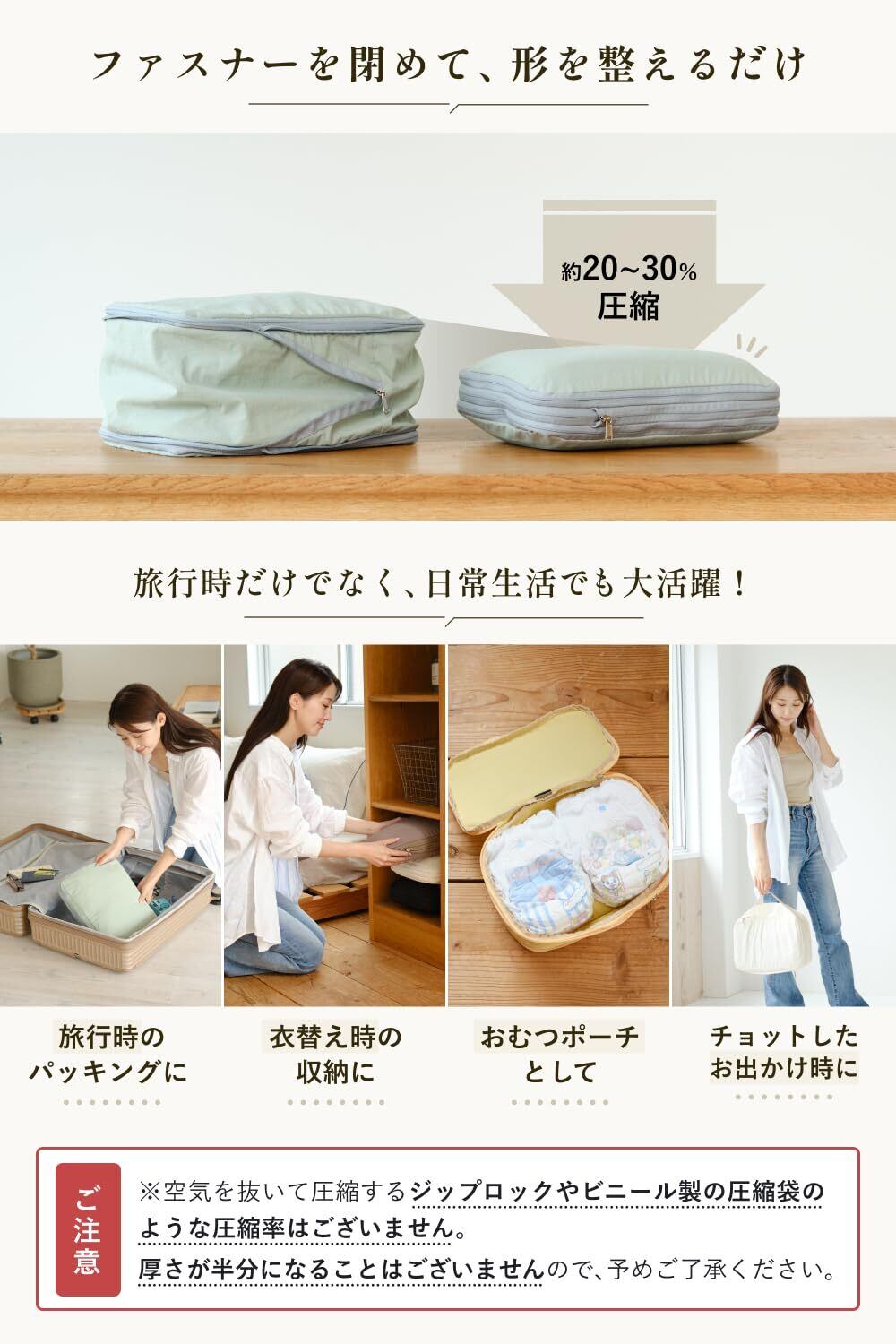 【ファスナーで圧縮、パッキングも楽ちん】 圧縮袋と違い、いちいち空気を抜いたりしなくていいので、パッキングも楽ちんです。